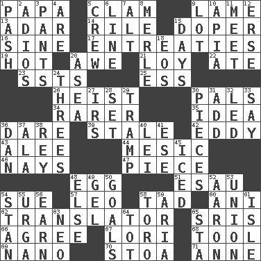 ACROSS 1. Dad 5. Burrowing marine mollusk 9. Unable to walk 13. The sixth month of the Jewish calendar 14. Cause heat under the collar 15. Drug addict 16. Trig term 17. Pleas 19. Being at a high temperature 20. Deep reverence 21. Myrna of the movies 22. Had dinner 23. Fast planes 25. Double-curved letter 26. Robbery 30. Friends 34. Less widely known 35. It may be bright or harebrained 36. Have the gumption 39. Lacking originality or spontaneity 42. Whirlpool 43. Toward shelter 44. Of or pertaining to a meson 46. Negative votes 47. Part 48. Ovum 51. He sold his birthright 54. Take to court 57. Lion 58. Small amount or degree 60. Black tropical American cuckoo 62. Interpreter 65. Indian titles of respect 66. Match 67. Australian parrot (variant) 68. Instrument 69. Billionth: prefix 70. Portico 71. Singer Murray DOWN 1. Romantic infatuation 2. Goodbye (Sp.) 3. Leg coverings 4. "We ___ not amused" (Victoria) 5. Group working together 6. Actor's bit 7. Keyboard modifier key 8. Haggard of country music 9. Car dealer's back yard 10. Capital of Western Samoa 11. Rendezvous 12. Celtic language 15. 24-hour periods 18. Greek goddess of the dawn 20. Toward the sea 24. Triplets 27. Big collection agency 28. Put into a specified state 29. _____ steamer (cargo ship) 30. Components 31. Find the sum of 32. Directed 33. Declare 36. One of the 12 tribes of Israel 37. According to 38. Marina Del _, California 40. Luau accessory 41. Compass dir. 45. On the rocks 48. Otherwise 49. Set 50. Scores awarded for successful feats 52. Composer Copland 53. The state of being joined or united 54. Comedian Laurel of Laurel & Hardy 55. Capital and largest city of Mongolia 56. Merit 58. "Corrida" creature 59. Operatic vocal solo 61. Capri or Wight 63. Modern: prefix 64. Small child 65. R.R. building