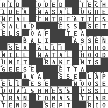ACROSS 1. To free from 4. Wrote a lyric poem 8. Technology 12. The content of cognition 14. Rhinal 16. Legendary monster 17. Be tempered by heat 18. Pleas 20. Vegetable dish 22. Curvy letter 23. Arrange properly for use 24. Raised railways 25. Clumsy lout 28. Afternoon social gathering 30. Indonesian resort city 31. NE Netherlands city 35. Ocean 37. Set down 40. Through, poetically 41. Place where flour is made 42. Relating to or accompanying birth 44. Parka part 45. A single undivided whole 46. Libertine 47. Mountains (abbr.) 48. Honkers 50. Singer James 52. Actress Gardner 54. Compass dir. 55. Pet locale 58. Biblical high priest 61. Compass dir. 63. Trap for birds or small mammals 65. Innocence, gentleness, or tenderness 70. Inconspicuous attention getter 71. SW Asia republic 72. Ferber et al. 73. Pull into pieces 74. Be inclined (to) 75. Back-to-school mo. 76. River (Sp.) DOWN 1. Wash lightly 2. Standard of perfection 3. Allots cards 4. Single 5. One of the 12 tribes of Israel 6. Eastern Standard Time (abbr.) 7. Have the gumption 8. Small child 9. The front part of a cuirass 10. Algonquian 11. Command 13. Wing 15. For fear that 19. At sea 21. ___ good deed 26. Actor Alda or Thicke 27. Of or pertaining to a thread or threads 29. Respiratory problem 30. Greek mezzo-soprano Agnes 32. Opportunity 33. Greek god of love 34. Allow head to fall sleepily 35. Trig term 36. Writer Wiesel 38. Call ___ day 39. Receives possession of 41. Java container 43. Allows 49. Nights before holidays 51. Nine, plus one 53. American tennis player Robert 55. Failure 56. Slender Brazilian palm 57. Stone: prefix 58. Prepare for publication 59. Old wives' tales, e.g. 60. "Terrible" tsar 62. Conclusions 64. Choose 66. Working for oneself (abbr.) 67. Compass dir. 68. Plant excrement 69. Fast jet (abbr.)
