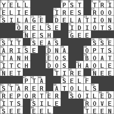 ACROSS 1. Shout 5. Pacific Standard Time (abbr.) 8. Three (prefix) 11. Writer Wiesel 12. Angers 13. Friend of Pooh 14. Fodder prepared in a silo 17. Accusation by an informer 19. Threatening words 21. Foolish or stupid persons 22. Tender 23. Unit of force equal to gravity 24. Be seated 27. Oceans 29. Compass dir. 32. Ascend 34. Heredity factor (abbr.) 36. Chooses 37. Hyperbolic tangent 38. Greek goddess of the dawn 39. Water vessel 40. Hankering 41. Two (Sp.) 42. White Person, in Hawaii 43. Fish or hair follower 44. Become fatigued 46. Born 47. Parent Teacher Association (abbr.) 50. Automatically 52. A viewer who gazes fixedly 55. Ringlike coral islands and reefs 57. Newsperson 59. Dirtied 62. It is 63. Filth; sediment 64. Be footloose 65. Perceive with the eye 66. Snakelike fish 67. Adolescent DOWN 1. It is so 2. Biblical high priest 3. _ and Stitch 4. Acquire or gain knowledge or skills 5. Before (prefix) 6. Major League Baseball Commissioner Bud 7. Sadhe (variant) 8. Musical group of three 9. Carrot, for example 10. Charged atoms 12. Binary compound 15. Honkers 16. Otherwise 18. Neckwear 20. Cast a shadow over 24. Smooth fabric 25. Feeling or showing extreme anger 26. A color or tint 28. Snout, nose 29. Soup utensil 30. Showing deterioration from age 31. First name in cosmetics 33. Quiet! 35. Help 36. Chief or king in Benin or Nigeria 42. Phone greeting 45. Vintage cars 47. Adept person 48. Laconic 49. Nick name for Arthur 51. Talk or behave amorously 52. Indian titles of respect 53. Wig 54. Domed church section 55. "We ___ not amused" (Victoria) 56. _ gin 58. Pipe bend 60. First lady 61. Lair