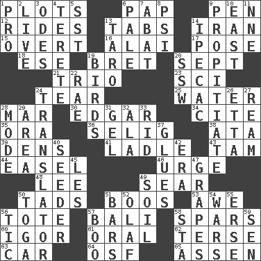 ACROSS 1. Small pieces of grounds 6. Infant food 9. Animal enclosure 12. Amusement-park features 13. Bar bills 14. SW Asia republic 15. Unconcealed 16. Jai _ 17. Airs 18. Compass dir. 19. Cy Young winner Saberhagen 20. Back-to-school mo. 21. Musical group of three 23. _-fi 24. Lacerate 25. Wetness 28. Impair 30. _ Allan Poe 34. Quote 35. Mouth or opening 36. Major League Baseball Commissioner Bud 38. _ moment's notice (2 wds.) 39. Habitations of wild animals 41. Dipping utensil 43. Scottish cap 44. Artist's stand 46. Goad 48. Area sheltered from the wind 49. Burn superficially 50. Small amounts or degrees 51. Expressions of contempt or scorn 53. Deep reverence 56. Lug 57. Indonesian resort city 58. Practice fights 60. Russian composer Stravinsky 61. Relating to the mouth 62. Laconic 63. Automobile 64. Order of Saint Francis (abbr.) 65. NE Netherlands city DOWN 1. Adept person 2. Not recorded 3. Lyric poems 4. Cylindrical with tapered ends 5. Fast jet (abbr.) 6. Diluted with white 7. Blind as ____ 8. Air pressure measure (abbr.) 9. Appease 10. 90 degrees 11. Compass dir. 13. Pacific island yam 14. Medicinal drug used to evoke vomiting 19. Avian creatures 20. Compass dir. 22. Actress Charlotte 24. Interpreter 26. Singer James 27. 480, 500 or 516 sheets of paper 28. Method 29. Type of rug 31. Set 32. Chicken ___ king 33. To free from 37. Cements 40. Sowing specialist 42. Epoch 45. French article 47. Wine fruits 49. Land 50. Ancient Roman robe 51. Taverns 52. Norwegian king 54. Armed conflicts 55. Celtic language 56. Nervous spasm 57. Sometimes accompanies a hiss 58. R.R. building 59. Elected rep.
