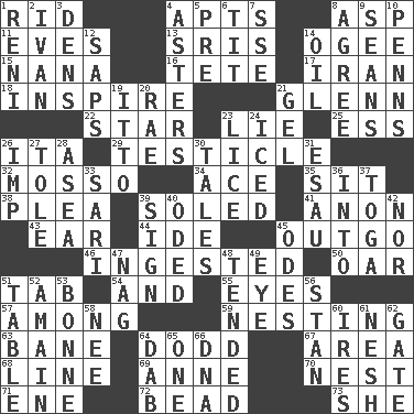 ACROSS 1. To free from 4. Flats, for short 8. Viper 11. Nights before holidays 13. Indian titles of respect 14. Double curve, resembling the letter S 15. Grandmother 16. False hair 17. SW Asia republic 18. Stimulate to action 21. American astronaut and politician John 22. Play the lead 23. Whopper 25. Curvy letter 26. Call ___ day 29. One of the two male reproductive glands 32. With motion or animation 34. Adept person 35. Be seated 38. Entreaty 39. Having a sole or soles 41. At once, immediately (arch.) 43. Ewer handle 44. Binary compound 45. Outlay 46. Swallowed 50. Rowing implement 51. Bar bill 54. Added to 55. Snake ____ (dice throw) 57. Amid 59. Nestling 63. Object of repulsion 64. Texas town _ City 67. Type of rug 68. Actor's bit 69. Singer Murray 70. A home for chicks 71. Compass dir. 72. Necklace unit 73. A female animal or person DOWN 1. Painter Guido (1575-1642) 2. _ the terrible 3. Hiding places for outlaws 4. Michaelmas daisies 5. Before (prefix) 6. Teat (slang) 7. Compass dir. 8. Match 9. Actors Connery and Penn 10. Actor Sean's family 12. Plant excrements 14. Lubricate 19. "Tell ____ the Marines!" 20. Actress Charlotte 21. Set 23. Louse (plural) 24. On the rocks 26. Mischievous child 27. Lacquered or enameled metalware 28. Toward the sea 30. Falsehoods 31. He sold his birthright 33. Indian skirt 36. To the inside or interior of 37. Ancient Roman robe 39. Public display of a written message 40. Wrote a lyric poem 42. And not 45. Lyric poems 47. Tired old horse 48. Watched over 49. Sight organ 51. Eating place 52. At full speed 53. Maid-servant 56. Comedian Laurel of Laurel & Hardy 58. Born 60. Angers 61. Soft 62. Yard entry 64. Apply (a substance) by light strokes 65. Single 66. Heredity factor (abbr.)