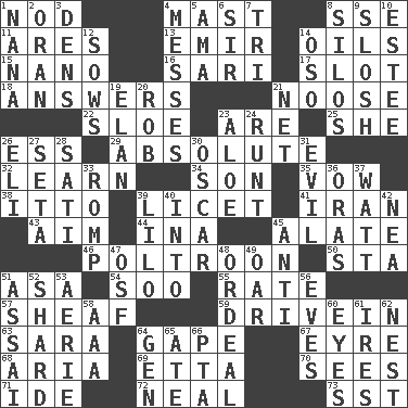 ACROSS 1. Lower and raise head in agreement 4. Vertical spar for supporting sails 8. Compass dir. 11. Ancient Greek god of war 13. Independent ruler or chieftain 14. Lubricates 15. Billionth: prefix 16. Indian skirt 17. Groove 18. Replies 21. Trap for birds or small mammals 22. A type of plum 23. "We ___ not amused" (Victoria) 25. A female animal or person 26. Double-curved letter 29. Utter; complete 32. Memorize 34. Male child 35. Promise 38. "Tell ____ the Marines!" 39. It is permitted: Lat. 41. SW Asia republic 43. Direct toward a target or goal 44. _ tizzy (2 wds.) 45. Having winglike extensions 46. Coward 50. R.R. building 51. White ___ sheet 54. "Barney Miller" actor Jack 55. Assign a rank or rating to 57. To gather and bind into a bundle 59. Popular '50s hangout 63. "Two Mules for Sister ____" 64. Open wide 67. Jane of fiction 68. Operatic vocal solo 69. Singer James 70. Observes 71. Binary compound 72. Anneal 73. Fast jet (abbr.) DOWN 1. Nanny 2. Northwest Algerian city 3. Lairs 4. Makes clutter 5. Housemaid (var.) 6. Title for a knight 7. Three (prefix) 8. Grain storage towers 9. Agitate, as a liquid 10. First name in cosmetics 12. Sty mamas 14. Bear (Spanish) 19. Enthusiasm 20. Director Reiner 21. Fish or hair follower 23. Medicinal plant 24. Undersized animal 26. Connecticut Ivy Leaguer 27. Bristle 28. Suttee (variant) 30. Motion picture award 31. Morally bad or wrong 33. Frolic 36. Mouths or openings 37. Electrical Unit 39. _ and Stitch 40. To the inside or interior of 42. Teachers' org. 45. Against 47. Order of Saint Francis (abbr.) 48. Severe or trying experience 49. Rowing implement 51. Slender Brazilian palm 52. Broken piece 53. Nest on high 56. Nights before holidays 58. Auto club (abbr.) 60. Snake ____ (dice throw) 61. Angers 62. Egg locale 64. Commissioned mil. rank 65. Had dinner 66. Parent Teacher Association (abbr.)