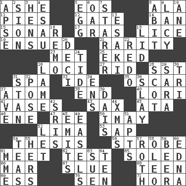 ACROSS 1. American tennis player Robert 5. Greek goddess of the dawn 8. In the manner of 11. Sliced desserts 12. Yard entry 14. Forbid 15. Underwater navigation system 17. Pate de foie ____ 18. Louse (plural) 19. Took place subsequently 21. Noteworthy scarcity 23. Was introduced to 25. Supplemented with great effort 26. Event scenes 27. To free from 28. Fast jet (abbr.) 31. Health resort 33. Binary compound 35. Witty Wilde 37. Smallest unit of an element 38. Conclude 40. Australian parrot (variant) 41. Flower holders 43. Saxophone 45. _ moment's notice (2 wds.) 46. Compass dir. 47. To separate or throw off 50. "If ____ say so..." 52. Pale green bean 53. Plant excrement 54. College paper 56. Disco prop 61. Confront 62. Trial 65. Having a sole or soles 66. Third mo. 67. Turn sharply 68. Adolescent 69. Curvy letter 70. Elected rep. 71. Israeli folk dance DOWN 1. Domed church section 2. The Jewish people; Israel 3. Coop moms 4. Son of Isaac 5. Oval reproductive body of a fowl 6. Boat paddle 7. A viewer who gazes fixedly 8. "This won't hurt ____!" 9. Made of lace 10. A saturated hydrocarbon 13. 1973 Nobel Price Winner (Physics) Leo 16. San ____ (Riviera town) 18. Flaplike covering 20. Tenth: prefix 22. Do over again 24. Event that recurs at intervals 26. Unable to walk 28. Highlander 29. "Two Mules for Sister ____" 30. Three (prefix) 31. Comedian Laurel of Laurel & Hardy 32. Airs 34. Followers of ems 36. Kill 37. "___ Maria" 39. Raised platform 42. Indian titles of respect 44. Dec. holiday 48. Sends forth 49. Artist's stands 51. Flats, for short 52. Allow 54. Afternoon social gatherings 55. Possessive pronoun 57. Writer of Portnoy's Complaint (1969) 58. Butter sub 59. Fermented drink made from hops 60. Pulitzer Prize-winning author Ferber 61. Madame (abbr.) 63. Institute legal proceedings 64. Nine, plus one