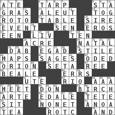 ACROSS 1. Had dinner 4. Canvas cover 8. R.R. building 11. Pate de foie ____ 13. Native American of Southwest Alaska 15. Coat; cloak 16. Printing process, for short 17. Eating place 18. Father 19. Happening 21. Elected rep. 22. Greek god of love 23. Car or cant ending 24. 54 in ancient Rome 27. Nine, plus one 29. Measure of real estate 30. Relating to or accompanying birth 34. Small moist lump or mass 36. Mild oath 39. Vertical member of a panel or frame 40. Atlas contents 41. Gurus 43. Wrote a lyric poem 44. Constellation of myth 46. Bristle 47. Portuguese money of account (variant) 48. Memphis, Tenn. Street 49. Blunders 51. Shoshoni 53. _ de Janeiro 54. American Automobile Association (abbr.) 57. Confront 60. Spanish title 63. A tree used for making furniture 65. Johnson of "Laugh-In" 66. Peak District village in England 69. False hair 70. Be seated 71. Music written for nine 72. Small Philippine buffalo 73. Beverage made from leaves 74. College mil. group 75. Plus DOWN 1. Match 2. Collection of objects 3. Eroded 4. Make lace 5. According to 6. Confederate soldiers (slang) 7. Whimper 8. Commotion 9. "Corrida" creature 10. Grows older 12. Male offspring 14. Portable shelter 18. Elected representatives 20. Affectionate concern, for short 25. Angers 26. Viva Las _ 28. Followers of ems 29. Utter; complete 31. Periodic rise and fall of the sea level 32. Toward shelter 33. Directed 34. Have the gumption 35. Capital of Western Samoa 37. Ripen 38. Prevent from occurring 40. Crowd into 42. Indian skirt 45. Remaining after all deductions 50. Director Reiner 52. Paradise 54. Sports stadium 55. Gambison 56. Toward the future 57. Vertical spar for supporting sails 58. 4th largest of the Great Lakes 59. Singer James 61. Aroma 62. Billionth: prefix 64. Call ___ day 67. Allow 68. And so on (abbr.)