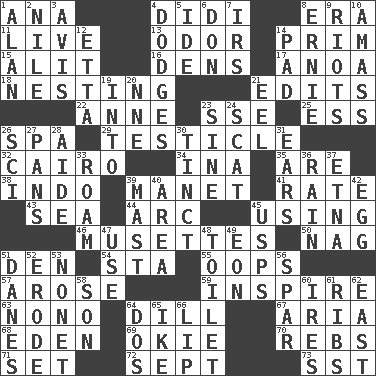 ACROSS 1. Santa ___, CA 4. "You Light Up My Life" star Conn 8. Period 11. Not recorded 13. Scent 14. Demure 15. Set down 16. Cub Scout units 17. Small Philippine buffalo 18. Snuggling 21. Prepares for publication 22. Singer Murray 23. Compass dir. 25. Double-curved letter 26. Health resort 29. A testis 32. Capital of Egypt 34. _ tizzy (2 wds.) 35. "We ___ not amused" (Victoria) 38. Southeast Asian peninsula 39. French painter Edouard 41. Pace 43. Ocean 44. Curve 45. Putting into practice 46. French bagpipes 50. Tired old horse 51. Lair 54. R.R. building 55. I made a mistake 57. Came up 59. Stimulate to action 63. Words to Nanette 64. Deli pickle 67. Roberta Peters solo 68. Genesis locale 69. Migrant worker of the '30s 70. Confederate soldiers (slang) 71. Arrange properly for use 72. Back-to-school mo. 73. Fast jet (abbr.) DOWN 1. ____ Jay Lerner 2. The longest river in the world 3. Opinion 4. Evades 5. Binary compound 6. Spanish title 7. Big collection agency 8. Bert's buddy 9. Disturbances 10. Collect or gather 12. Singer James 14. Groovy apt. 19. To the inside or interior of 20. Compass dir. 21. Snakelike fish 23. Trig term 24. Scram! 26. _-fi 27. Baking dishes 28. Assistant 30. Tinged 31. Hearing organs 33. Wander aimlessly 36. Water falling in drops from the sky 37. Inactive volcano in Sicily 39. Vertical spar for supporting sails 40. Type of rug 42. Ovum 45. United States Postal Service (abbr.) 47. Purpose 48. Bathroom plumbing fixture 49. Period of immesurable duration 51. Natives or inhabitants of Denmark 52. Eat (away) 53. Music written for nine 56. Coast Guard woman 58. Male offspring 60. Angers 61. Chest bones 62. 90 degrees 64. Two (Sp.) 65. D.D.E's nickname 66. Mouth edge