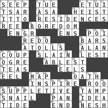 ACROSS 1. Ooze 5. Third day of the wk. 8. Needle case 12. Russian ruler of old 13. White ___ sheet 14. Robbery 15. "Tell ____ the Marines!" 16. Homes 19. Portuguese money of account (variant) 20. Mood resulting from idleness 21. Engineer (abbr.) 23. Followers of ems 24. Luau course 27. Make new 30. Soap units 31. Ringlike coral islands and reefs 34. ____ Jay Lerner 35. Overturn; upset 38. Killed 40. For fear that 41. Legendary monster 42. Most capable 44. Afternoon social gatherings 45. Snakelike fish 46. Snakelike fish 47. Atlas unit 50. Pledge 53. Heighten or intensify 57. Friend of Pooh 59. Supplying deficiencies 63. Pack (down) 64. Slow-paced one 65. Baking dish 66. The main thing one is thinking about 67. Periodic rise and fall of the sea level 68. Conclude 69. Tender DOWN 1. Use a swizzle stick 2. First name in cosmetics 3. Ingested 4. Adept person 5. Edible starchy tuberous root 6. One who uses or employs something 7. Comfort 8. Car or cant ending 9. Nervous spasm 10. Purpose 11. It is 14. Equivocates 17. Binary compound 18. Spanish title 20. Cy Young winner Saberhagen 22. Wine fruits 24. Light colored 25. Mouths or openings 26. Is not 28. Two (Sp.) 29. Rounded earthenware pot or jar 30. Greek mezzo-soprano Agnes 32. Experiment locale 33. Filth; sediment 35. ____ d'Azur (French Riviera) 36. Double curve, resembling the letter S 37. Mountain range 39. Born 43. _ gin 47. Place where flour is made 48. One (Scot) 49. Pacific Standard Time (abbr.) 51. Buy and sell 52. Residences 54. Corncob 55. "Terrible" tsar 56. Tear apart 58. Brightly colored fish 59. Fast jet (abbr.) 60. Corn or form start 61. Groovy apt. 62. Sliced dessert 63. Shallow baking pan