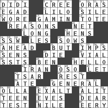 ACROSS 1. "You Light Up My Life" star Conn 5. Algonquian 9. Mouths or openings 13. Mild oath 14. _ and Stitch 15. Drop; flow; fall 16. Had on 17. Homeless child 18. Carryall 19. Thinks logically 21. Fish or hair follower 22. Yearn 23. Coop moms 24. Compass dir. 27. French article 28. Sty mamas 29. Having the leading position 31. Yet 32. Naughty children 36. Elected reps. 37. Pass on 38. Small bottle 39. Fast planes 40. Benjamin's nick name 41. Phone greeting 42. SW Asia republic 44. Bear (Spanish) 46. Allow 47. Russian ruler of old 48. Repose 50. Had dinner 51. Commissioned military rank 54. Spanish pot 56. Glorify 58. Came down and settled, as after flight 60. Adolescent 61. Nights before holidays 62. Letter starter 63. Trial 64. Mediterranean tributary 65. Suggestive of the supernatural DOWN 1. Morning condensation 2. Composer Stravinsky 3. Have the gumption 4. Standard of perfection 5. Rings like a ship's bell 6. Basketball hoops 7. Connecticut Ivy Leaguer 8. A really long time 9. Clearly or manifestly demonstrative 10. Disturbances 11. The first octave above the treble staff 12. Observe 17. Went 20. Exchanged or delivered for money 21. ___ Haven, CT 23. Being at a high temperature 24. Backtalk 25. "______ My Girl" (Turtles hit) 26. Gone 28. Take to court 30. Aide 31. Storage container 33. Place where flour is made 34. Light colored 35. Notch 37. Lair 40. Drinking establishment 41. Stockings 43. Actress Charlotte 44. Threatening words 45. Posted 47. Stories 49. Exchange 51. Highlander 52. Toward shelter 53. One who doesn't tell the truth 54. Baseball player Mel 55. Area sheltered from the wind 56. Car or cant ending 57. 16 59. Attempt