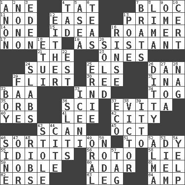 ACROSS 1. A saturated hydrocarbon 4. Make lace 7. Alliance 11. Lower and raise head in agreement 12. Comfort 13. A-one 14. Single 15. The main thing one is thinking about 16. Nomad 17. Music written for nine 19. Aide 21. Definite Article 23. Washington bills 24. Institutes legal proceedings 25. Raised railways 26. Daniel's nick name 29. Talk or behave amorously 30. To riddle 31. _ tizzy (2 wds.) 32. Sound made by sheep 33. Indiana (abbr.) 34. Coat; cloak 35. Globe 36. _-fi 37. Webber/Rice musical 40. Affirmative reply 41. Area sheltered from the wind 42. Municipality 43. Skim 45. Sep. follower 46. Casting lots 51. Sycophant 55. Foolish or stupid persons 56. Printing process, for short 58. Untruth 59. Impressive in appearance 60. The sixth month of the Jewish calendar 61. Cartoonist voice _ Blanc 62. Celtic language 63. Part of a journey 64. Electrical Unit DOWN 1. At once, immediately (arch.) 2. Words to Nanette 3. Paradise 4. Bit 5. At sea 6. Beverages made from leaves 7. Naughty children 8. Pale green bean 9. Sign of something about to happen 10. Certainty 12. One or the other of two 13. Introduce or present, as a question 16. Wash lightly 18. Needle case 20. Having a sole or soles 22. Eastern Standard Time (abbr.) 24. Broad, flat, thick pieces 25. Bert's buddy 26. Simple song 27. Small Philippine buffalo 28. Tired old horse 29. Conductor's collection 32. Male child 33. Ancient Celtic tribe of eastern Britain 36. Narrow boards 37. Environmental prefix 38. Winning man's name 39. "Tell ____ the Marines!" 43. Fur scarf 44. Quote 46. Trig term 47. Aroma 48. Teases 49. Relating to the mouth 50. Connecting point 52. _ mater 53. South Vietnam president (1954) 54. Sharp bark 57. Label