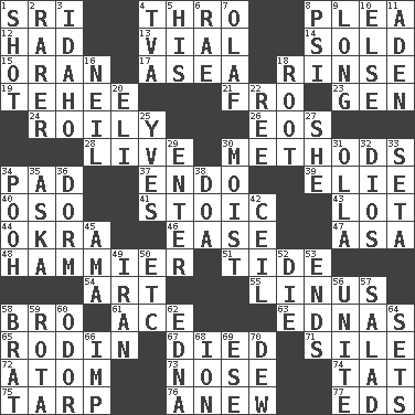 ACROSS 1. Indian title of respect (Mr.) 4. Through, poetically 8. Entreaty 12. Possessed 13. Small bottle 14. Exchanged or delivered for money 15. NW Algerian seaport 17. At sea 18. Remove soap 19. Giggle 21. Back 23. Commissioned mil. rank 24. Agitated, as a liquid 26. Greek goddess of the dawn 28. Not recorded 30. Modes 34. Writing tablet 37. Inside; within (prefix) 39. Writer Wiesel 40. Bear (Spanish) 41. Unemotional 43. Car dealer's back yard 44. Gumbo ingredient 46. Comfort 47. White ___ sheet 48. More overdramatic by comparison 51. Periodic rise and fall of the sea level 54. Tate display 55. "_ and Lucy" (Charlie Brown theme song) 58. Sis' sibling 61. Adept person 63. Ferber et al. 65. "The Thinker" sculptor 67. Passed on 71. Filth; sediment 72. Smallest unit of an element 73. Characteristic smell of wine 74. Make lace 75. Canvas cover 76. Afresh 77. Begley and Asner DOWN 1. Went for two points 2. More uncommon 3. Potato state 4. Federal power corp. 5. Part of HMS, perhaps 6. Actress Charlotte 7. Norwegian king 8. 23rd letter of the Greek alphabet 9. Yearn 10. Otherwise 11. Arabian gulf 16. Famous astronaut Armstrong 18. Carrot, for example 20. Connecticut Ivy Leaguer 22. To separate or throw off 25. Jacques Cousteau's middle name 27. A female animal or person 29. Keyboard key 30. Damp 31. Rounded earthenware pot or jar 32. "Vaya con ____" 33. Stalk of a moss capsule 34. "Silly old bear" 35. "____ silly question..." 36. Dormintory (informal) 38. ___ good deed 42. To provide with a ceiling 45. Nanny (var.) 49. SW Asia republic 50. And so on (abbr.) 52. Pass on 53. Conclusions 56. Join together 57. Vegetable dish 58. Naughty child 59. Round or rotation of duties 60. Aroma 62. Pulitzer Prize-winning author Ferber 64. Arranges properly for use 66. Naughty child 68. Electrically charged atom 69. Compass dir. 70. Morning condensation
