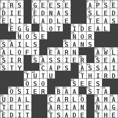 ACROSS 1. Big collection agency 4. Honkers 9. Domed church section 13. Expire 14. Ferber et al. 15. Downhill vehicle 16. Connecticut Ivy Leaguer 17. Dipping utensil 18. Beverages made from leaves 19. Ovum 21. Car dealer's back yard 22. Standard of perfection 24. Characteristic smell of wine 26. And not 27. Travels by water 29. Without 30. High up in or into the air 31. Merit 33. Leather borer 36. Title for a knight 37. More lively and spirited 40. Ocean 41. Filthy place 42. Smile enhancers 43. Slender Brazilian palm 45. Ballerina skirt 47. One of three equal parts 48. Bear (Spanish) 49. Perceives with the eye 50. Flexible twig of a willow tree 52. Sound made by sheep 54. R.R. building 56. Hereditary estate 57. Monte _, Las Vegas Hotel/Casino 59. Wet nurse (var.) 61. False hair 62. Believer in; advocate of (suffix) 63. Tired old horse 64. Prepare for publication 65. Sadhe (variant) 66. Definite Article DOWN 1. Binary compound 2. Cause heat under the collar 3. Signiory (variant) 4. Set 5. Peak District village in England 6. Inside; within (prefix) 7. Table seasoning 8. Compass dir. 9. Michaelmas daisies 10. Entreaty 11. Lick closed 12. Begley and Asner 20. _ course 22. Silly 23. Spanish title 25. Fast planes 27. Backtalk 28. Set down 29. Indian titles of respect 31. Son of Isaac 32. Viper 33. Helper 34. Put on (as clothing) 35. Put down 38. Thespian 39. Pace 44. "______ My Girl" (Turtles hit) 45. Bathroom plumbing fixture 46. Purpose 49. Vegetable dish 50. Wrote a lyric poem 51. Suttee (variant) 52. Long, evenly shaped pieces 53. Roberta Peters solo 55. Nanny 56. Shoshoni 57. Feline 58. Single 60. Grow older
