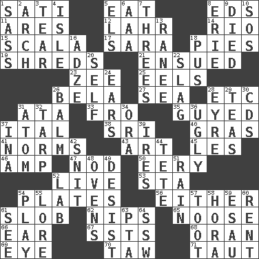 ACROSS 1. Suttee (variant) 5. Ingest 8. Begley and Asner 11. Ancient Greek god of war 12. Cowardly lion portrayer 14. _ de Janeiro 15. Any of the three canals of the cochlea 17. "Two Mules for Sister ____" 18. Sliced desserts 19. Tears up 21. Followed as a consequence or result 23. Last letter of the English alphabet 25. Snakelike fish 26. Actor Lugosi 27. Ocean 28. And so on (abbr.) 31. _ moment's notice (2 wds.) 33. Back 35. Secured 37. Slanted text style (abbr.) 38. Indian title of respect (Mr.) 40. Pate de foie ____ 41. Typical standards 43. Tate display 45. French article 46. Electrical Unit 47. Lower and raise head in agreement 50. Suggestive of the supernatural 52. Not recorded 53. R.R. building 54. Food holders 56. One or the other of two 61. Oscar Madison type 62. Cuts off 65. Trap for birds or small mammals 66. Ewer handle 67. Fast planes 68. Northwest Algerian city 69. Sight organ 70. The 23rd letter of the Hebrew alphabet 71. Pulled tight DOWN 1. Backtalk 2. Bowlike part 3. Separate forcefully 4. Small island 5. Raised railways 6. American Automobile Association (abbr.) 7. Trios 8. 4th largest of the Great Lakes 9. Passed on 10. Distress signal 13. Indian princess (variant) 16. Axlike tool, used for shaping wood 18. Product of festering 20. Automatic 22. Volcanic refuse 24. Hearing organs 26. Lip ointment 28. Jane of fiction 29. Beverages made from leaves 30. Music discs 31. Tiny particle 32. Canvas cover 34. Mouth or opening 36. Unsightly 37. _ tizzy (2 wds.) 39. Angers 42. In a ____ (agitated or irritated) 44. False hair 48. Baking chambers 49. Cease 51. Water falling in drops from the sky 52. Experiment locale 54. Live dramatic performance 55. Old wives' tales, e.g. 57. A blast of a horn 58. Israeli folk dance 59. Son of Isaac 60. Monthly bill 61. Perceive with the eye 63. Parent Teacher Association (abbr.) 64. Compass dir.