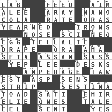 ACROSS 1. Experiment locale 4. Nourish 8. Direct toward a target or goal 11. Toward shelter 13. Like ___ of sunshine 14. Billionth: prefix 15. Root beer relative 16. Assign a rank or rating to 17. Mouths or openings 18. Felt deep pity or tenderness 21. Metal shackles 22. Characteristic smell of wine 23. _-fi 25. Modern: prefix 26. Ovum 29. Copy Pinocchio 32. Window treatment 34. Mouth or opening 35. Nursemaid (var.) 38. Bristle 39. Indian state 41. Backtalk 43. Slangy assent 44. Area sheltered from the wind 45. Writing tables 46. Electrical Measurement 50. The 23rd letter of the Hebrew alphabet 51. Eastern Standard Time (abbr.) 54. Cleo's killer 55. Elected reps. 57. Remove all contents or possession from 59. French poetic form 63. Frog relative 64. Suttee (variant) 67. Arab leader 68. Writer Wiesel 69. Washington bills 70. Lie 71. Snakelike fish 72. Posted 73. It is so DOWN 1. Made of lace 2. _ vera 3. Actor Lugosi 4. Burden 5. Period 6. Consume 7. Color 8. Composer Copland 9. Empty; void 10. With motion or animation 12. Merit 14. Not either 19. Short letter 20. Compass dir. 21. One more than two 23. "Two Mules for Sister ____" 24. Dollar (slang) 26. Begley and Asner 27. Jennifer or Joel 28. Yard entry 30. Failure 31. Relaxation 33. Dad 36. Vertical spar for supporting sails 37. "____ silly question..." 39. High mountains 40. Ooze 42. Compass dir. 45. Habitations of wild animals 47. Atlas unit 48. Aid 49. Turn to the right 51. First name in cosmetics 52. Took without asking 53. Hang back 56. Proofreading order 58. Binary compound 60. "If ____ say so..." 61. Mediterranean tributary 62. Ancient Greek god of war 64. Distress signal 65. A saturated hydrocarbon 66. "___ Little Indians"