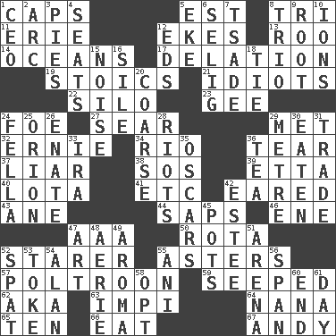 ACROSS 1. Smile enhancers 5. Eastern Standard Time (abbr.) 8. Three (prefix) 11. 4th largest of the Great Lakes 12. Makes supply last 13. Friend of Pooh 14. Seas 17. Accusation by an informer 19. Unemotional ones 21. Foolish or stupid persons 22. Grain storage tower 23. Unit of force equal to gravity 24. Enemy 27. Wither 29. Was introduced to 32. Bert's buddy 34. River (Sp.) 36. Pull apart 37. One who doesn't tell the truth 38. Mayday 39. Singer James 40. Globular water bottle used in Asia 41. And so on (abbr.) 42. Having ears or earlike features 43. One (Scot) 44. Plant excrements 46. Compass dir. 47. American Automobile Association (abbr.) 50. Roll call or roster of names 52. A viewer who gazes fixedly 55. Michaelmas daisies 57. Coward 59. Oozed 62. Alias (abbr.) 63. Body of Kaffir warriors 64. Nanny 65. Nine, plus one 66. Ingest 67. "60 Minutes" Commentator Rooney DOWN 1. Corporate head (abbr.) 2. Curve 3. Sliced desserts 4. Theater features 5. Supplement with great effort 6. Former Milwaukee Brewers owner Bud 7. Sadhe (variant) 8. Musical group of three 9. Carrot, for example 10. Charged particles 12. Begley and Asner 15. Annoying sound 16. Filth; sediment 18. Neckwear 20. Rough 24. Man or boy (slang) 25. Greek mythologigal hunter 26. Maternal 28. Disturbances 29. Distance measurement (Brit.) 30. Eroded 31. Buy and sell 33. Lyricist Gershwin 35. Motion picture awards 36. Afternoon social gathering 42. First name in cosmetics 45. Plant holders 47. Tate display 48. Nest on high 49. Scent 51. Sports stadium 52. Argument over a trivial matter 53. Casino tip 54. Actor Alda or Thicke 55. Black tropical American cuckoo 56. Connect, as a bridge 58. Elect 60. Conclude 61. 24 hours