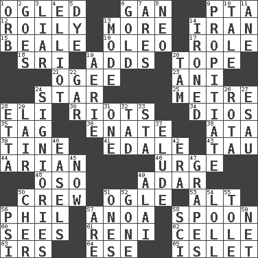 ACROSS 1. Stared at amorously 6. Separate the seeds from cotton 9. Parent Teacher Assoc. 12. Turbulent 13. Greater amount 14. SW Asia republic 15. Memphis, Tenn. Street 16. Margarine 17. Hero or heavy, e.g. 18. _ Lanka 19. Sums up 20. Drink excessively 21. Double curve, resembling the letter S 23. Black tropical American cuckoo 24. Play the lead 25. Distance measurement (Brit.) 28. Biblical high priest 30. Disturbances 34. "Vaya con ____" 35. Label 36. Related on the mother's side 38. "One Day ___ Time" 39. Prong on a fork 41. Peak District village in England 43. The 19th letter of the Greek alphabet 44. Believer in; advocate of (suffix) 46. Goad 48. Bear (Spanish) 49. The sixth month of the Jewish calendar 50. Group working together 51. Stare 53. The first octave above the treble staff 56. Silvers or Donahue 57. Small Philippine buffalo 58. Soup utensil 60. Perceives with the eye 61. Painter Guido (1575-1642) 62. Cell (Danish) 63. Big collection agency 64. Compass dir. 65. Small island DOWN 1. Globe 2. Leaves 3. One who doesn't tell the truth 4. American author Paul (1891-1958) 5. Color 6. Precious metal 7. Ancient Greek god of war 8. Modern: prefix 9. Conciliate 10. Lie 11. A saturated hydrocarbon 13. Method 14. Pressed 19. Nest on high 20. Scottish cap 22. Slender fish 24. Seigniories (variant) 26. Round or rotation of duties 27. Son of Isaac 28. Singer James 29. Den 31. Single 32. Small amount or degree 33. R.R. building 37. Evade 40. Artist's stands 42. Period 45. Immediately 47. Raisin fruits 49. Mountain range southwest of Kyrgyzstan 50. "Mermaids" star 51. Washington bills 52. Went 54. Hang loosely or laxly 55. Lacquered or enameled metalware 56. 23rd letter of the Greek alphabet 57. "We ___ not amused" (Victoria) 58. _-fi 59. Remaining after all deductions