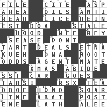 ACROSS 1. Do some clerical work 5. Quote 9. Viper 12. Type of rug 13. Petroleums 14. Opposed to 15. Posterior 16. Louse (plural) 17. It's straight from the horse's mouth 18. Eastern Standard Time (abbr.) 19. ___ good deed 21. Having lost freshness 22. Parka part 24. Born 26. Marina Del _, California 27. Gospel singer Marvin 28. Do not 29. Small pie 30. Allots cards 32. Inactive volcano in Sicily 36. Malaysian steamed pastry 37. Heredity factor (abbr.) 38. Carrot, for example 39. Probability 40. Rep 42. Nathan's nickname 43. Dec. holiday 44. Remain 46. Fast jet (abbr.) 49. Automobile 50. Leaves 51. Tarsus (plural) 53. Acura sports coupe 54. Afternoon social gathering 57. Mitch Miller's instrument 58. Same (prefix) 61. Fly high 62. Actor's bit 63. Blind as ____ 64. Mail 65. Compass dir. 66. Thin strip of wood or metal 67. Toward shelter DOWN 1. Conductor's collection 2. Angers 3. Resembling or made to resemble leather 4. Hearing organ 5. Root beer relative 6. One more than two 7. Affectionate concern, for short 8. Compass dir. 9. Approach 10. Vertical member of a panel or frame 11. Abounding in pines 14. Tate display 19. Two (Sp.) 20. Wrote a lyric poem 21. Arrange properly for use 23. Expletives 24. Pitcher Ryan 25. Followers of ems 27. Saudi Arabian king (1953-1964) 28. Natives or inhabitants of Denmark 29. Ring climax 31. _ Allan Poe 32. Bert's buddy 33. Inedible or poisonous agaric 34. Observe 35. Had dinner 40. Nursemaid (var.) 41. Labels 43. One more than ninety 45. Gift holder 46. Took without asking 47. Unit of acoustic absorption 48. Heavy duty weighing machine 52. Perceive with the eye 53. Writer of Portnoy's Complaint (1969) 55. Comfort 56. Johnson of "Laugh-In" 58. Actor Linden 59. Chief or king in Benin or Nigeria 60. Floor covering 61. Health resort