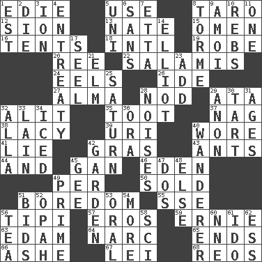ACROSS 1. Singer Brickell 5. Purpose 8. Pacific island yam 12. The Jewish people; Israel 13. Nathan's nickname 15. Presage 16. Portable shelters 18. International (abbr.) 19. Loose flowing garment 20. To sift 22. Deli grouping 24. Snakelike fish 26. Binary compound 27. _ mater 28. Lower and raise head in agreement 29. _ moment's notice (2 wds.) 32. Came down and settled, as after flight 35. A blast of a horn 37. Tired old horse 38. Made of lace 39. RI univ. 40. Had on 41. Falsehood 42. Pate de foie ____ 43. Pismires 44. Plus 45. Separate the seeds from cotton 46. Locale of original sin 49. For each 50. Exchanged or delivered for money 51. Mood resulting from idleness 55. Compass dir. 56. Native american tent (variation) 57. Greek god of love 59. Bert's buddy 63. Dutch treat 64. Drug cop 65. Extremities 66. American tennis player Robert 67. Luau accessory 68. Vintage cars DOWN 1. Eastern Standard Time (abbr.) 2. Expire 3. Electrically charged atom 4. Plea 5. Single; one (prefix) 6. Without 7. Singer James 8. Singer Mel 9. Mine, in Marseilles 10. Confederate soldiers (slang) 11. Single 14. American author Paul (1891-1958) 17. Sew up the eyelids of hawks and falcons 21. Shade tree 23. Increase 25. Titan orbits this 28. Annoying sounds 29. At once, immediately (arch.) 30. Small pie 31. Eras 32. Silent film actress Nazimova 33. (Had) reclined 34. On the rocks 36. Mouth or opening 40. Roamer 42. Place where plants grow 45. Unit of force equal to gravity 47. Two (Sp.) 48. Otherwise 49. First class 51. Auction offers 52. Brightly colored fish 53. Spoken 54. Greater amount 56. Beverage made from leaves 58. _-fi 60. Compass dir. 61. Wedding promise 62. Double-curved letter