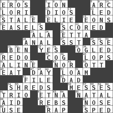 ACROSS 1. Greek god of love 5. Electrically charged atom 8. Curve 11. Australian parrot (variant) 12. "Vaya con ____" 14. Directed 15. Showing deterioration from age 17. Writer Wiesel 18. Immeasurably long periods of time 19. Artist's stands 21. Tallied 23. Wing 25. Singer James 26. Of or related to the anus 27. Fast jet (abbr.) 28. Compass dir. 31. Benjamin's nick name 33. Affirmative reply 35. Stared 37. Redecorate 38. Gear tooth 40. Chops off 41. Place in a line 43. And not 45. Baseball player Mel 46. Consume 47. 24 hours 50. Rich soil 52. Do some clerical work 53. June honoree 54. Tears up 56. Makes clutter 61. Musical group of three 62. Inactive volcano in Sicily 65. Brizilian seaport 66. Assist 67. Confederate soldiers (slang) 68. Olfactory organ 69. Purpose 70. Strike 71. Drove too fast DOWN 1. Otherwise 2. Roll call or roster of names 3. Mouths or openings 4. Drop; flow; fall 5. Binary compound 6. Petroleum 7. Annoying sounds 8. Medicinal plant 9. Tear apart 10. Music discs 13. Religious groups 16. Enthusiasm 18. Period 20. Kill 22. Von Bismarck 24. Actor Baldwin 26. Soon (poet.) 28. Slit 29. Back-to-school mo. 30. Begley and Asner 31. Actor Lugosi 32. Prepare for publication 34. Boy, to dad 36. Take by theft 37. Actress Charlotte 39. Precious metal 42. Singer Brickell 44. Wander aimlessly 48. Tree or shrub in the Birch family 49. Next before 51. An important port of Yemen 52. From 54. Indian titles of respect 55. Flintstone garb 57. Without 58. Obstruct or block passage 59. Relaxation 60. Downhill vehicle 61. The 19th letter of the Greek alphabet 63. Basketball assoc. 64. Viper