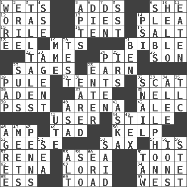 ACROSS 1. Soaks 5. Sums up 9. A female animal or person 12. Mouths or openings 13. Sliced desserts 14. Entreaty 15. Cause heat under the collar 16. Portable shelter 17. Table seasoning 18. Snakelike fish 19. Mountains (abbr.) 21. The Good Book 22. Docile 24. Sliced dessert 26. Manchild 27. Gurus 28. Merit 29. Whine 30. Portable shelters 32. Scram! 36. Arabian gulf 37. Had dinner 38. 1994 drama film starring Jodie Foster 39. Inconspicuous attention getter 40. Sports stadium 42. Actor Baldwin 43. One who uses or employs something 44. Vertical member of a panel or frame 46. Electrical Unit 49. Bit 50. Seaweed 51. Honkers 53. Saxophone 54. Part of HMS, perhaps 57. French philosopher Descartes 58. Toward the sea 61. A blast of a horn 62. Inactive volcano in Sicily 63. Australian parrot (variant) 64. Queen of England 1702-14 65. Double-curved letter 66. Frog relative 67. 270 degrees DOWN 1. Had on 2. 4th largest of the Great Lakes 3. Baron Munchausen's specialties 4. Compass dir. 5. Tenement units (abbr.) 6. Expire 7. Lair 8. Fast jet (abbr.) 9. Thick slices 10. Phone greeting 11. Ingested 14. Air pressure measure (abbr.) 19. Madame (abbr.) 20. Trial 21. Benjamin's nick name 23. Representative 24. Eucharist need 25. Big collection agency 27. Soap bubbles 28. Keyboard key 29. Infant food 31. Having ears or earlike features 32. Slow-paced one 33. Portable communications device 34. Toward shelter 35. Affectionate concern, for short 40. White ___ sheet 41. "____ silly question..." 43. Shoshoni 45. John Ritter's dad 46. Match 47. Confronts 48. Actor Sean's family 52. Ocean 53. Alleged 55. Charged particles 56. Proofreading order 58. Keyboard modifier key 59. "Barney Miller" actor Jack 60. Epoch 61. The 23rd letter of the Hebrew alphabet