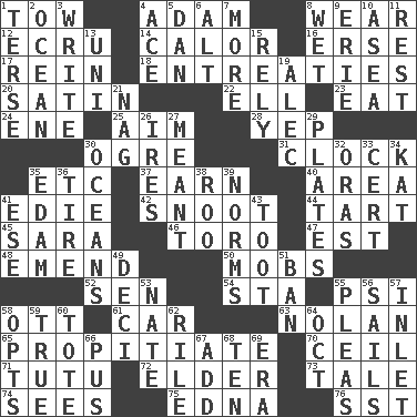 ACROSS 1. Pull behind 4. First of billions? 8. Put on (as clothing) 12. Shade of tan 14. Bodily heat indicating an inflammation 16. Celtic language 17. It's straight from the horse's mouth 18. Pleas 20. Smooth fabric 22. Pipe bend 23. Ingest 24. Compass dir. 25. Direct toward a target or goal 28. Slangy assent 30. Legendary monster 31. Timepiece 35. And so on (abbr.) 37. Merit 40. Length times width 41. Singer Brickell 42. Snob 44. Small pie 45. "Two Mules for Sister ____" 46. "Corrida" creature 47. Eastern Standard Time (abbr.) 48. Make improvements or corrections to 50. Crowds into 52. Elected rep. 54. R.R. building 55. Air pressure measure (abbr.) 58. Baseball player Mel 61. Automobile 63. Pitcher Ryan 65. Conciliate 70. To provide with a ceiling 71. Ballerina skirt 72. A person who is older than you are 73. Falsehood 74. Perceives with the eye 75. Pulitzer Prize-winning author Ferber 76. Fast jet (abbr.) DOWN 1. Laconic 2. Sea 3. Compose 4. Adept person 5. One of the 12 tribes of Israel 6. Keyboard modifier key 7. Greater amount 8. Dripping 9. One of the Great Lakes 10. At sea 11. Take ten 13. Corn or form start 15. Trust 19. Actor Baldwin 21. Tired old horse 26. Angers 27. Intended 29. Food holders 30. Seas 32. Mouths or openings 33. Foregone conclusion 34. Krazy ___ of comics 35. Dutch treat 36. Hoop that covers a wheel 38. Friend of Pooh 39. Typical models 41. Compass dir. 43. A blast of a horn 49. Tenth: prefix 51. Bar 53. Nathan's nickname 55. Entreaties 56. Moves on water 57. An arm off of a larger body of water 58. Elects 59. Loyal 60. Carry 62. Cause heat under the collar 64. Sep. follower 66. Fluid product of inflammation 67. Find the sum of 68. Nine, plus one 69. Epoch