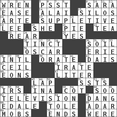 ACROSS 1. Songbird 5. Inconspicuous attention getter 9. "Two Mules for Sister ____" 13. Comfort 14. Jai _ 15. Grain storage towers 16. Johnson of "Laugh-In" 17. Supplementary 19. Area sheltered from the wind 20. A female animal or person 21. Sliced dessert 22. Afternoon social gathering 23. Posterior 25. Consenting reply 26. Tinged 30. Land 34. Motion picture award 35. 4th largest of the Great Lakes 36. International (abbr.) 39. Speak pompously 42. Raised platform 43. To provide with a ceiling 44. Feeling or showing extreme anger 46. Immeasurably long periods of time 47. 61 cubic inches 48. Pet locale 51. Fast planes 54. Big collection agency 57. _ tizzy (2 wds.) 58. Small bed 60. "Barney Miller" actor Jack 62. Boob tube 65. Mild oath, euphamism for damn 66. Peak District village in England 67. Lacquered or enameled metalware 68. The sixth month of the Jewish calendar 69. Crowds into 70. Extremities 71. We are DOWN 1. Welt 2. Less widely known 3. First name in cosmetics 4. Born 5. Romantic infatuation 6. Turn sharply 7. Plant excrement 8. Likely to tip or tilt 9. Be seated 10. Came down and settled, as after flight 11. Be footloose 12. At sea 15. Observes 18. Falsehood 20. Indian titles of respect 24. Ringlike coral islands and reefs 27. Non-commissioned officer (abbr.) 28. 4-wheeled motor vehicle 29. Go after with the intent to catch 30. Spring feasts 31. Mouth or opening 32. One more than two 33. French article 36. Frozen water 37. Modern: prefix 38. Metal container 40. Three (prefix) 41. Erode 45. Trial 48. Moving, as bait 49. Black tropical American cuckoo 50. Thick mixture 52. Sadhe (variant) 53. Echolocation 54. Detail 55. Make new 56. Broad, flat, thick piece 58. Lacking warmth 59. Washington bills 61. Legendary monster 63. Raised railways 64. Electrically charged atom 65. Fool