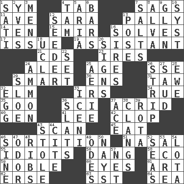 ACROSS 1. Symbol (abbr.) 4. Bar bill 7. Sinks 11. "___ Maria" 12. "Two Mules for Sister ____" 13. Chummy 14. Nine, plus one 15. Independent ruler or chieftain 16. Finds the solution 17. Come out of 19. Helper 21. Music discs 23. Angers 24. Toward shelter 25. Grow older 26. Compass dir. 29. Don Adams' spy role 30. Followers of ems 31. The 23rd letter of the Hebrew alphabet 32. Shade tree 33. Big collection agency 34. Regret 35. Thick or sticky substance 36. _-fi 37. Sour-tasting 40. Commissioned mil. rank 41. Area sheltered from the wind 42. Hoof sound 43. Skim 45. Consume 46. Determination 51. Rhinal 55. Foolish or stupid persons 56. Mild oath, euphamism for damn 58. Environmental prefix 59. Impressive in appearance 60. Sight organs 61. Tate display 62. Celtic language 63. Fast jet (abbr.) 64. Ocean DOWN 1. Suttee (variant) 2. Jacques Cousteau's middle name 3. Not women's 4. Scottish cap 5. Operatic vocal solo 6. Taverns 7. Table seasonings 8. Inventor's middle name 9. Small, secluded valley 10. System (abbr.) 12. Sowing specialist 13. Introduce or present, as a question 16. Founders of families 18. Southern CA. univ. 20. Attaches a signature 22. Arrange properly for use 24. ID or VA city 25. Nest on high 26. Remove all contents or possession from 27. Saudi Arabian king (1953-1964) 28. She-sheep 29. _ gin 32. Ovum 33. Ancient Celtic tribe of eastern Britain 36. Narrow boards 37. Adept person 38. Rings like a ship's bell 39. Roll call or roster of names 43. Took without asking 44. Quote 46. Trig term 47. Aroma 48. Teases 49. Lyric poems 50. Negative votes 52. Oceans 53. Land measure 54. Globular water bottle used in Asia 57. Remaining after all deductions
