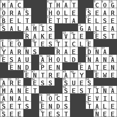 ACROSS 1. Big _ 4. Not this but _ 8. Gear tooth 11. Mouths or openings 13. Hollow 14. Wither 15. Waist strap 16. Singer James 17. Otherwise 18. Deli grouping 21. An organ shaped like a helmet 22. Immoral or dissolute person 23. Compete 25. Eastern Standard Time (abbr.) 26. Lion 29. A testis 32. Tall tales 34. Actress Charlotte 35. Heredity factor (abbr.) 38. Son of Isaac 39. Hold, grip (Informal) 41. Nanny 43. Conclude 44. Animal enclosure 45. Ingested 46. Plea 50. She-sheep 51. "We ___ not amused" (Victoria) 54. Double-curved letter 55. Takes to court 57. French painter Edouard 59. French poetic form 63. Of or related to the anus 64. Locales 67. Morally bad or wrong 68. Arranges properly for use 69. Conclusions 70. Lie 71. Observe 72. Trial 73. Born DOWN 1. Crowds into 2. Length times width 3. Give a ring to 4. College papers 5. Being at a high temperature 6. Keyboard modifier key 7. Afternoon social gathering 8. Cell (Danish) 9. Fertile tracts in a desert 10. Relatively large 12. Play the lead 14. Ocean 19. Floor protectors 20. Mamie's mate 21. Set 23. Small bottle 24. On the rocks 26. Sodium hydroxide 27. Comfort 28. NW Algerian seaport 30. Heavy duty weighing machine 31. Pulitzer Prize-winning author Ferber 33. Naked 36. Nathan's nickname 37. Afresh 39. Tenement units (abbr.) 40. Possessive pronoun 42. One (Scot) 45. Sight organs 47. Fish or hair follower 48. Help 49. Third day of the wk. 51. Collect or gather 52. Indian princess (variant) 53. Maternal 56. Proofreading order 58. Raised railways 60. "Terrible" tsar 61. The longest river in the world 62. Toward shelter 64. Allow 65. Single 66. Music discs