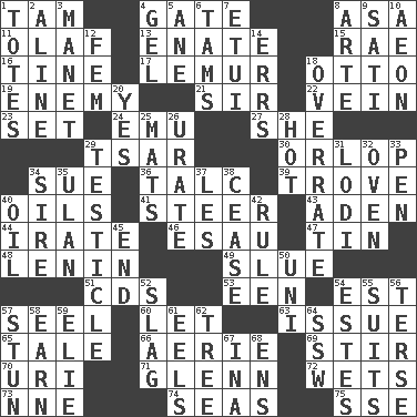 ACROSS 1. Scottish cap 4. Yard entry 8. White ___ sheet 11. Norwegian king 13. Related on the mother's side 15. Actress Charlotte 16. Prong on a fork 17. Arboreal primate 18. Von Bismarck 19. Foe 21. Title for a knight 22. Distinctive style or manner 23. Arrange properly for use 24. Australian flightless bird 27. A female animal or person 29. Russian ruler of old 30. Lowest deck of a ship 34. Institute legal proceedings 36. Baby powder 39. Collection of objects 40. Petroleums 41. Bull 43. Arabian gulf 44. Feeling or showing extreme anger 46. He sold his birthright 47. Metal container 48. Soviet premier 1918-24 49. Turn sharply 51. Music discs 53. Car or cant ending 54. Eastern Standard Time (abbr.) 57. Stitch closed the eyes of (a falcon) 60. Allow 63. Come out of 65. Lie 66. Nest on high 69. Move through with a circular motion 70. RI univ. 71. American astronaut and politician John 72. Moistens 73. Compass dir. 74. Oceans 75. Compass dir. DOWN 1. Lugs 2. Place in a line 3. French painter Edouard 4. Set 5. One (Scot) 6. Scottish caps 7. Needle case 8. Johnson of "Laugh-In" 9. Suttee (variant) 10. A really long time 12. Opposite of masc. 14. Blunders 18. Make much ado about nothing 20. Affirmative reply 25. Floor protectors 26. A salt of uric acid 28. Being at a high temperature 29. A testis 31. Farming town in central California 32. Baking chamber 33. Fenced enclosure 34. Beget 35. ____ Bator 37. French article 38. Stop 40. Petroleum 42. Court order 45. Conclusion 50. Single; one (prefix) 52. Volcanic refuse 54. _____ Park, CO 55. Costumes for special activities 56. Laconic 57. Make senseless or dizzy 58. Merit 59. Writer Wiesel 61. Snakelike fish 62. Woody plant 64. Compass dir. 67. _ tizzy (2 wds.) 68. Followers of ems