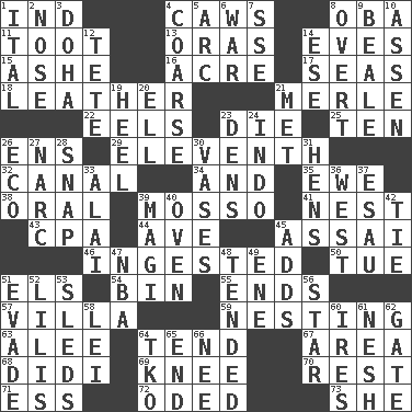 ACROSS 1. Indiana (abbr.) 4. Crow sounds 8. Chief or king in Benin or Nigeria 11. A blast of a horn 13. Mouths or openings 14. Nights before holidays 15. American tennis player Robert 16. Land measure 17. Oceans 18. Cordwainer's material 21. Haggard of country music 22. Snakelike fish 23. Expire 25. "___ Little Indians" 26. Followers of ems 29. Veterans Day date 32. Lessep's creation 34. Added to 35. She-sheep 38. Of the mouth 39. With motion or animation 41. A home for chicks 43. Tax preparer (abbr.) 44. "___ Maria" 45. Slender Brazilian palm 46. Consumed 50. Third day of the wk. 51. Raised railways 54. Storage container 55. Conclusions 57. Country estate 59. Snuggling 63. Toward shelter 64. Be inclined (to) 67. Type of rug 68. "You Light Up My Life" star Conn 69. Leg joint 70. Remainder 71. Double-curved letter 72. Wrote a lyric poem 73. A female animal or person DOWN 1. Slanted text style (abbr.) 2. Olfactory organ 3. Capital of the state of Qatar 4. Unrefined 5. Curve 6. Armed conflict 7. Compass dir. 8. Unconcealed 9. Memphis, Tenn. Street 10. NE Netherlands city 12. Wig 14. Compass dir. 19. The bottom of a shoe or boot 20. Pipe bend 21. Was introduced to 23. Lairs 24. _ china 26. Environmental prefix 27. Drug cop 28. Fastener 30. Flower holders 31. Coop moms 33. Jai ____ 36. Compass direction 37. Son of Isaac 39. Wise men 40. Baking chamber 42. Make a knot 45. Sums up 47. Basketball assoc. 48. Looked after 49. Compass dir. 51. Elude 52. Ms. Damita and namesakes 53. Bobsleighs 56. Play the lead 58. Luau accessory 60. Angers 61. Tender 62. Yard entry 64. Ring climax 65. Conclusion 66. Born