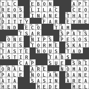ACROSS 1. Affectionate concern, for short 4. Inky black, to poets 8. Fitting 11. Vintage cars 13. Pale purple color 15. Corporate head (abbr.) 16. Singer Murray 17. Lacking in sense or substance 18. Not this but _ 19. Short, simple song 21. Distant 22. Jane of fiction 23. Conclusion 24. Environmental prefix 27. Scottish cap 29. Russian ruler of old 30. Arguments over trivial matters 34. Single 36. Pinches, bites 39. Mexican monetary units 40. Angers 41. Singer Mel 43. Three-handed card game 44. Clothes sense 46. Common sense 47. Bit 48. Moving or stirring 49. Bar bills 51. Head covering 53. Institute legal proceedings 54. _ Lanka 57. Relating to the mouth 60. "We ___ not amused" (Victoria) 63. Roamer 65. Diluted with white 66. Pitcher Ryan 69. Object of repulsion 70. _ moment's notice (2 wds.) 71. Indian antelope 72. Type of rug 73. Layer 74. Ancient Persian 75. Cartoonist voice _ Blanc DOWN 1. Buy and sell 2. Soviet premier 1918-24 3. Continued (abbr.) 4. Connecticut Ivy Leaguer 5. Storage container 6. Norwegian king 7. Nanny 8. Painful 9. Lightbulb-shaped fruit 10. Carryall 12. Put into a specified state 14. Certainty 18. Storms 20. Affirmative reply 25. Patter 26. Constellation of myth 28. Cleo's killer 29. One of the two male reproductive glands 31. "____ silly question..." 32. Frog relative 33. Fast jet (abbr.) 34. Mouths or openings 35. Egg locale 37. Adept person 38. Particles of soot 40. Call ___ day 42. He sold his birthright 45. Period 50. Benjamin's nick name 52. Baking dishes 54. Excessive but superficial compliments 55. Indian princess (variant) 56. Perfect 57. Brightly colored fish 58. Pace 59. ____ Jay Lerner 61. Wander 62. Otherwise 64. Chief or king in Benin or Nigeria 67. Assist 68. Compass dir.