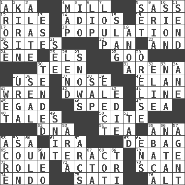 ACROSS 1. Alias (abbr.) 4. Place where flour is made 8. Backtalk 12. Cause heat under the collar 14. Goodbye (Sp.) 16. One of the Great Lakes 17. Mouths or openings 18. Census information 20. Settings 22. Baking dish 23. Also 24. Compass dir. 25. Raised railways 28. Thick or sticky substance 30. Adolescent 31. Sports stadium 35. Purpose 37. Olfactory organ 40. Liveliness 41. Songbird 42. A sleeping potion; an opiate (poet.) 44. Actor's bit 45. Mild oath 46. Moved rapidly 47. Ocean 48. Falsehoods 50. Quote 52. Heredity factor (abbr.) 54. Beverage made from leaves 55. Santa ___, CA 58. White ___ sheet 61. Lyricist Gershwin 63. Debunk (Brit. slang) 65. Neutralize 70. Nathan's nickname 71. Hero or heavy, e.g. 72. Thespian 73. Glance over 74. Inside; within (prefix) 75. Suttee (variant) 76. Keyboard modifier key DOWN 1. Came up 2. Japanese brewing company 3. Having winglike extensions 4. Atlas unit 5. Wedding promise 6. Mouth edge 7. Central Nebraska county 8. Arrange properly for use 9. Operatic vocal solo 10. The Jewish people; Israel 11. Transmit 13. Compass dir. 15. Volcanic refuse 19. Small Philippine buffalo 21. Perceive with the eye 26. Grant temporary use of 27. Overwhelms 29. Threatening words 30. Watched over 32. Writer Wiesel 33. Grandmother 34. A saturated hydrocarbon 35. Capital and largest city of Mongolia 36. Lick closed 38. Plant excrement 39. Opt 41. Dripping 43. Singer Brickell 49. In a ____ (agitated or irritated) 51. Small amount or degree 53. Type of rug 55. Phillipine bananalike plant 56. Relating to or accompanying birth 57. Representative 58. 43,560 square feet 59. Within a short period 60. Old (Scot.) 62. Curves 64. Followers of ems 66. Modern: prefix 67. "One Day ___ Time" 68. Small bed 69. Three (prefix)