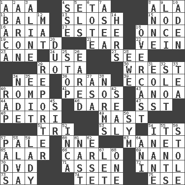 ACROSS 1. American Automobile Association (abbr.) 4. Stalk of a moss capsule 8. Wing 11. Lip ointment 13. Make a splashing sound 15. Dreamland 16. Operatic vocal solo 17. First name in cosmetics 18. Single time 19. Continued (abbr.) 21. Ewer handle 22. Distinctive style or manner 23. One (Scot) 24. Purpose 27. Observe 29. Roll call or roster of names 30. Obtain by seizing forcibly or violently 34. Born 36. Northwest Algerian city 39. Learning spot: Fr. 40. Play 41. Mexican monetary units 43. Small Philippine buffalo 44. Goodbye (Sp.) 46. Have the gumption 47. Fast jet (abbr.) 48. _ dish (used to culture cells) 49. Vertical spar for supporting sails 51. Three (prefix) 53. Wily 54. ___ a Wonderful Life 57. Light colored 60. Compass dir. 63. French painter Edouard 65. Having or resembling wings 66. Monte _, Las Vegas Hotel/Casino 69. Billionth: prefix 70. Movie disc 71. NE Netherlands city 72. International (abbr.) 73. Declare 74. Wig 75. Compass dir. DOWN 1. Phillipine bananalike plant 2. Composer Copland 3. Place in a line 4. Compass dir. 5. Raised railways 6. Carry 7. Toward the sea 8. Queen of England 1702-14 9. Locales 10. Arabian gulf 12. Floor covering 14. Possessive pronoun 18. Cloudy 20. Superhero pair 25. Discontinue 26. Having ears or earlike features 28. She-sheep 29. Newsperson 31. Immeasurably long periods of time 32. Narrow, elongated depression 33. Afternoon social gathering 34. Connecting point 35. Give off 37. White ___ sheet 38. Typical models 40. Strike 42. Lick closed 45. Title for a knight 50. Symbol (abbr.) 52. South American Indian 54. Silly 55. Portable shelters 56. Fur scarf 57. Groovy apts. 58. Inventor's middle name 59. Kenny Rogers chart-topper in '80 61. Political cartoonist Thomas 62. Celtic language 64. Black tropical American cuckoo 67. Allow 68. Single