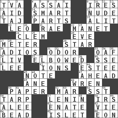 ACROSS 1. Federal power corp. 4. Slender Brazilian palm 9. Angers 13. Help 14. Don Adams' spy role 15. Naked 16. _ Mahal 17. Pieces 18. Came down and settled, as after flight 19. Lion 21. Actress Charlotte 22. French painter Edouard 24. Clement's nick name 26. Night before a holiday 27. Distance measurement 29. Play the lead 30. Goodbye (Sp.) 31. Aroma 33. Clumsy lout 36. 54 in ancient Rome 37. Turned at an angle; bent 40. Compass dir. 41. Area sheltered from the wind 42. Charged atoms 43. First name in cosmetics 45. Short letter 47. At or in the front 48. One (Scot) 49. Songbird 50. Some stationery 52. Spoil 54. Fast jet (abbr.) 56. Canvas cover 57. Soviet premier 1918-24 59. Big collection agency 61. Toward shelter 62. Related on the mother's side 63. Compete 64. Necklace unit 65. Small island 66. A really long time DOWN 1. Make lace 2. Small bottle 3. Descriptive word 4. Viper 5. Excessive but superficial compliments 6. "Two Mules for Sister ____" 7. Johnson of "Laugh-In" 8. ___ a Wonderful Life 9. More empty; more void 10. Governing power 11. Prepare for publication 12. Put into a specified state 20. Butter sub 22. Distance measurement (Brit.) 23. Actress Gardner 25. Celtic language 27. Promenade 28. Singer Brickell 29. Sty mamas 31. Mitch Miller's instrument 32. Spanish title 33. Clearly or manifestly demonstrative 34. Toward the sea 35. Nourish 38. 61 cubic inches 39. Letter starter 44. "______ My Girl" (Turtles hit) 45. Slept 46. Single 49. Compose 50. Light colored 51. Length times width 52. Not women's 53. Of or related to the anus 55. Musical group of three 56. Keyboard key 57. Luau accessory 58. Remaining after all deductions 60. Elected rep.