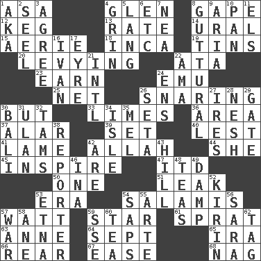 ACROSS 1. White ___ sheet 4. Small, secluded valley 8. Open wide 12. Cask 13. Assign a rank or rating to 14. Mountain range 15. Nest on high 18. South American Indian 19. Metal containers 20. Imposing or collecting, as a tax 22. _ moment's notice (2 wds.) 23. Merit 24. Australian flightless bird 25. Fish or hair follower 26. Catching in a trap 30. On the contrary 33. Citrus fruits 36. Type of rug 37. Having or resembling wings 39. Put into a specified state 40. For fear that 41. Unable to walk 42. Assad's deity 44. A female animal or person 45. Motivate 47. It would 50. Single 51. Path through which fluid escapes 53. Epoch 54. Deli grouping 57. Electrical Unit 59. Play the lead 61. Small fatty European fish 63. Queen of England 1702-14 64. Back-to-school mo. 65. Retirement account (abbr.) 66. Stern 67. Relaxation 68. Tired old horse DOWN 1. Alias (abbr.) 2. Sew up the eyelids of hawks and falcons 3. Match 4. Smile widely 5. Austrian-born American filmmaker Fritz 6. And so on (abbr.) 7. Teachers' org. 8. From the throat 9. Roberta Peters solo 10. Baking dish 11. Raised railways 16. _ the terrible 17. Jane of fiction 21. International (abbr.) 22. Nanny (var.) 24. Followers of ems 26. Stalk of a moss capsule 27. Angers 28. Soft 29. Yard entry 30. Indonesian resort city 31. ____ Bator, Mongolia 32. Scottish caps 34. Capri or Wight 35. Cartoonist voice _ Blanc 38. News announcer 42. "We ___ not amused" (Victoria) 43. Land elevation 46. _ tizzy (2 wds.) 48. Beverages made from leaves 49. Moist 52. Japanese brewing company 53. Inactive volcano in Sicily 54. Plant excrements 55. Johnson of "Laugh-In" 56. "Two Mules for Sister ____" 57. Armed conflict 58. One (Scot) 59. Compass dir. 60. Beverage made from leaves 62. Label