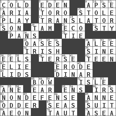 ACROSS 1. Lacking warmth 5. Paradise 9. Domed church section 13. Roberta Peters solo 14. "Corrida" creature 15. Fur scarf 16. Romp 17. Interpreter 19. Male child 20. Scottish cap 21. Environmental prefix 22. Filthy place 23. Zero-star reviews 25. Standoff 26. Fertile tracts in a desert 30. Toward shelter 34. From or relating to Ireland 35. Trig term 36. Snakelike fish 39. Laconic 42. Adolescent 43. Writer Wiesel 44. Wear away 46. Flaplike coverings 47. Middle Eastern gold or silver currency 48. Ribbon knot 51. Capri or Wight 54. A saturated hydrocarbon 57. Ewer handle 58. Followers of ems 60. Big collection agency 62. Unrelated to defense, as in spending 65. Singer Murray 66. More peculiar 67. Oceans 68. Set or collection 69. A really long time 70. Strained 71. Toward the sea DOWN 1. Smile enhancers 2. Fourth or lowest deck 3. Climbing, woody, usually tropical vines 4. 24 hours 5. Singer James 6. Dormintory (informal) 7. Period 8. Music written for nine 9. _ moment's notice (2 wds.) 10. Cooking vessels 11. Notch 12. Suggestive of the supernatural 15. A type of plum 18. _-fi 20. Russian ruler of old 24. Annoying sounds 27. Be seated 28. Compass dir. 29. Fragment 30. Michaelmas daisies 31. Falsehood 32. Compass dir. 33. Car or cant ending 36. Snakelike fish 37. Biblical high priest 38. Flaplike covering 40. Indian title of respect (Mr.) 41. A really long time 45. Raised platform 48. Fermented drink made from hops 49. Clumsy lout 50. Obtain by seizing forcibly or violently 52. "_ and Lucy" (Charlie Brown theme song) 53. Bert's buddy 54. Small Philippine buffalo 55. Connecting point 56. Inside; within (prefix) 58. He sold his birthright 59. Egg locale 61. Stalk of a moss capsule 63. Lair 64. Teachers' org. 65. White ___ sheet