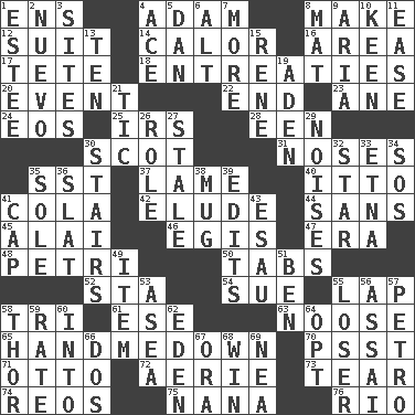 ACROSS 1. Followers of ems 4. First of billions? 8. Create 12. Set of matching outer garments 14. Bodily heat indicating an inflammation 16. Type of rug 17. False hair 18. Pleas 20. Happening 22. Conclusion 23. One (Scot) 24. Greek goddess of the dawn 25. Big collection agency 28. Car or cant ending 30. Highlander 31. Olfactory organs 35. Fast jet (abbr.) 37. Unable to walk 40. "Tell ____ the Marines!" 41. Root beer relative 42. Dodge 44. Without 45. Mountain range southwest of Kyrgyzstan 46. Armor plate that protects the chest 47. Period 48. _ dish (used to culture cells) 50. Bar bills 52. R.R. building 54. Institute legal proceedings 55. Pet locale 58. Three (prefix) 61. Compass dir. 63. Trap for birds or small mammals 65. Sleeping bag shop? 70. Inconspicuous attention getter 71. "Beetle Bailey" pooch 72. Nest on high 73. Separate forcefully 74. Vintage cars 75. Grandmother 76. River (Sp.) DOWN 1. First name in cosmetics 2. New (sp.) 3. Settings 4. Adept person 5. Daniel's nick name 6. The first octave above the treble staff 7. Greater amount 8. Floor protector 9. Operatic vocal solo 10. Peachy ____! 11. Relaxation 13. Nine, plus one 15. French philosopher Descartes 19. An important port of Yemen 21. Nervous spasm 26. Hero or heavy, e.g. 27. Having lost freshness 29. Annoying sounds 30. Flight of steps 32. Play the lead 33. Inactive volcano in Sicily 34. Mayday 35. Flatfish 36. Narrow board 38. Java container 39. Prepares for publication 41. Head covering 43. He sold his birthright 49. A whole individual unit 51. Benjamin's nick name 53. At sea 55. Failure 56. Slender Brazilian palm 57. Stone: prefix 58. Son of Odin 59. Pace 60. To the inside or interior of 62. Paradise 64. Elect 66. Two (Sp.) 67. Mouth or opening 68. Acquire through effort 69. Teachers' org.
