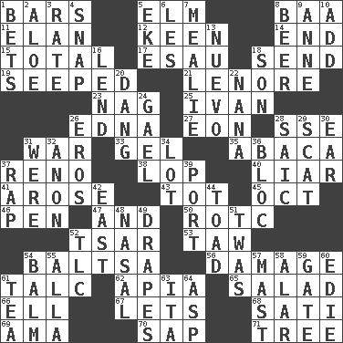 ACROSS 1. Oblong pieces of solid material 5. Shade tree 8. Sound made by sheep 11. Enthusiasm 12. Peachy ____! 14. Conclusion 15. "_____ Recall" 17. Son of Isaac 18. Transmit 19. Oozed 21. Poe poem 23. Tired old horse 25. "Terrible" tsar 26. Pulitzer Prize-winning author Ferber 27. Period of immesurable duration 28. Compass dir. 31. Armed conflict 33. Set 35. Phillipine bananalike plant 37. Former U.S. Attorney General Janet 38. Trim (branches) 40. One who doesn't tell the truth 41. Came up 43. Small child 45. Sep. follower 46. Writing instrument 47. Also 50. College mil. group 52. Russian ruler of old 53. The 23rd letter of the Hebrew alphabet 54. Greek mezzo-soprano Agnes 56. Break 61. Baby powder 62. Capital of Western Samoa 65. First course 66. Pipe bend 67. Allows 68. Suttee (variant) 69. Nursemaid (var.) 70. Plant excrement 71. Woody plant DOWN 1. Antes 2. Medicinal plant 3. Pace 4. Fastener 5. Make supply last 6. French article 7. Ear of corn 8. Fermented drink made from hops 9. Singer Murray 10. Find the sum of 13. New (sp.) 16. Grant temporary use of 18. Male offspring 20. Mild oath, euphamism for damn 22. Nanny 24. Highlander 26. Greek god of love 28. Ketch in the Levant 29. Scram! 30. Ewer handle 31. We are 32. Soon (poet.) 34. Car dealer's back yard 36. Alliance 37. Reproach for some lapse or misdeed 39. Sweet dark-red dessert wine 42. 90 degrees 44. Frog relative 48. Relating to the nose 49. Window treatments 51. It was, poetically 52. Affectionate concern, for short 54. Lip ointment 55. Silent film actress Nazimova 57. Vertical spar for supporting sails 58. Having or resembling wings 59. Yard entry 60. Singer Brickell 61. Afternoon social gathering 63. Call ___ day 64. Cleo's killer
