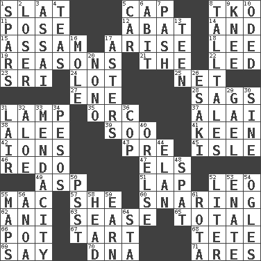 ACROSS 1. Narrow board 5. Head covering 8. Ring climax 11. Introduce or present, as a question 12. Blind as ____ 14. Plus 15. Indian state 17. Ascend 18. Area sheltered from the wind 19. Thinks logically 21. Definite Article 22. Directed 23. Indian title of respect (Mr.) 24. Car dealer's back yard 25. Fish or hair follower 27. Compass dir. 28. Droops 31. Desk light 35. The grampus (Milton) 37. Jai _ 38. Toward shelter 39. "Barney Miller" actor Jack 41. Peachy ____! 42. Charged atoms 43. Before (prefix) 45. Small island 46. Do over again 47. Raised railways 49. Cleo's killer 51. Pet locale 52. Lion 55. Big _ 57. A female animal or person 60. Catching in a trap 62. Cuckoo 63. Gospel singer Marvin 65. "_____ Recall" 66. Plant holder 67. Small pie 68. Wig 69. Declare 70. Heredity factor (abbr.) 71. Ancient Greek god of war DOWN 1. Practice fights 2. Failure 3. Slender Brazilian palm 4. Afternoon social gatherings 5. Auto 6. "This won't hurt ____!" 7. Romantic infatuation 8. Baron Munchausen's specialties 9. Leg joint 10. Wrote a lyric poem 13. Adolescent 16. Undercover agent 17. Michaelmas daisies 20. Words to Nanette 26. 1973 Nobel Price Winner (Physics) Leo 29. Highlander 30. Trig term 31. Den 32. _ vera 33. Ananias' fault 34. Mexican monetary units 36. Police officer (slang) 40. Threatening words 44. Style 48. Petty quarrel 50. Inconspicuous attention getter 52. 61 cubic inches 53. Related on the mother's side 54. Stares at amorously 55. Atlas contents 56. Small Philippine buffalo 58. Froth on beer 59. Merit 61. Round or rotation of duties 64. R.R. building
