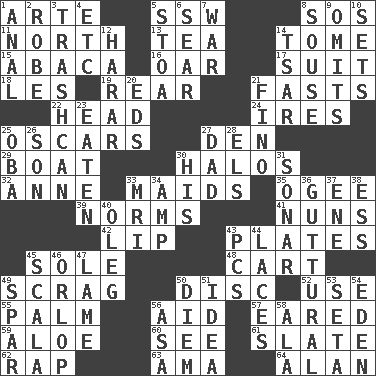 ACROSS 1. Johnson of "Laugh-In" 5. Compass dir. 8. Mayday 11. 0 degrees 13. Afternoon social gathering 14. Heavy book 15. Phillipine bananalike plant 16. Rowing implement 17. Set of matching outer garments 18. French article 19. Posterior 21. Goes without food and/or water 22. Froth on beer 24. Angers 25. Motion picture awards 27. Lair 29. Water vessel 30. Auras 32. Singer Murray 33. Unmarried girls 35. Double curve, resembling the letter S 39. Typical models 41. Religious women 42. Mouth edge 43. Food holders 45. Not divided or shared with others 48. Haul 49. Lean end of the neck 50. Compact _ 52. Purpose 55. Inside of hand 56. Help 57. Having ears or earlike features 59. Medicinal plant 60. Perceive with the eye 61. Schedule 62. Hit sharply and swiftly 63. Nursemaid (var.) 64. ____ Jay Lerner DOWN 1. Of or related to the anus 2. Loose flowing garment 3. File 13 4. And so on (abbr.) 5. Portico 6. Shrivel 7. Armed conflict 8. Lush 9. Leaves out 10. Puts into a specified state 12. Ethiopian city, capital of Harari 14. Russian ruler of old 20. Begley and Asner 21. A pale, very dry sherry 23. Consumed 25. Chief or king in Benin or Nigeria 26. Male offspring 27. June honoree 28. Raised railways 30. Part of HMS, perhaps 31. Underwater navigation system 33. Medical imaging device (abbr.) 34. Electrical Unit 36. From the throat 37. Compass dir. 38. Curvy letter 40. Cassini of fashion 43. Personal Computers (abbr.) 44. Shoestrings 45. Any of the three canals of the cochlea 46. Lowest deck of a ship 47. Unable to walk 49. Practice fight 50. South Vietnam president (1954) 51. The content of cognition 53. Stalk of a moss capsule 54. Paradise 56. White ___ sheet 58. Wing