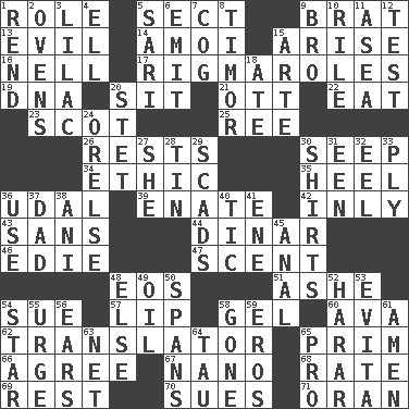 ACROSS 1. Hero or heavy, e.g. 5. Religious group 9. Naughty child 13. Morally bad or wrong 14. Mine, in Marseilles 15. Ascend 16. 1994 drama film starring Jodie Foster 17. Complicated, petty procedures 19. Heredity factor (abbr.) 20. Be seated 21. Baseball player Mel 22. Ingest 23. Native of Scotland 25. To separate or throw off 26. Musical pauses 30. Ooze 34. Moral principle 35. The bottom of a shoe or boot 36. Hereditary estate 39. Maternal 42. In an inward manner 43. Without 44. Middle Eastern gold or silver currency 46. Singer Brickell 47. Odor 48. Greek goddess of the dawn 51. American tennis player Robert 54. Institute legal proceedings 57. Mouth edge 58. Set 60. Actress Gardner 62. Interpreter 65. Demure 66. Match 67. Billionth: prefix 68. Pace 69. Remainder 70. Institutes legal proceedings 71. Northwest Algerian city DOWN 1. Tear apart 2. Baking chambers 3. Pale purple color 4. Pipe bend 5. Indian skirt 6. Give off 7. Gear tooth 8. Southeast Indonesia island 9. Sis' sibling 10. Cause heat under the collar 11. At sea 12. Trial 15. Johnson of "Laugh-In" 18. Had dinner 20. Proofreading order 24. Threatening words 27. A female animal or person 28. Metal container 29. Loads 30. Upper-body garments 31. Car or cant ending 32. Snakelike fish 33. Travel a route regularly 36. Purpose 37. June honoree 38. Cuckoo 40. Nervous spasm 41. Compass dir. 45. Of or related to the anus 48. Otherwise 49. Petroleum 50. Connects, as a bridge 52. Ethiopian city, capital of Harari 53. Webber/Rice musical 54. Play the lead 55. Goad 56. Hearing organs 58. Went 59. Greek god of love 61. So be it 63. Remaining after all deductions 64. The 19th letter of the Greek alphabet 65. Adept person