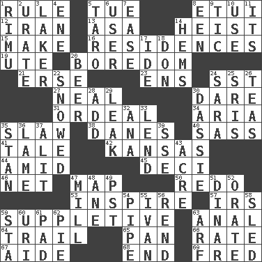 ACROSS 1. Governing power 5. Third day of the wk. 8. Needle case 12. SW Asia republic 13. White ___ sheet 14. Robbery 15. Create 16. Homes 19. Shoshoni 20. Mood resulting from idleness 21. Celtic language 23. Followers of ems 24. Fast jet (abbr.) 27. Be tempered by heat 30. Have the gumption 31. Severe or trying experience 34. Operatic vocal solo 35. Cole _ (cabbage dish) 38. Natives or inhabitants of Denmark 40. Backtalk 41. Falsehood 42. Sunflower state 44. Among 45. Tenth: prefix 46. Remaining after all deductions 47. Atlas unit 50. Make new 53. Motivate 57. Big collection agency 59. Supplementary 63. Of or related to the anus 64. Lag or linger behind 65. Baking dish 66. Assign a rank or rating to 67. Assistant 68. Conclusion 69. Flintstone DOWN 1. Tall New Zealand timber tree 2. A salt of uric acid 3. Member of a famous L.A. basketball team 4. Compass dir. 5. Edible starchy tuberous root 6. One who uses or employs something 7. Comfort 8. Car or cant ending 9. Nervous spasm 10. Purpose 11. It is 14. Cloth borders 17. Binary compound 18. Spanish title 20. Fermented drink made from hops 22. Frozen precipiation fell 24. "Two Mules for Sister ____" 25. Indian titles of respect 26. Afternoon social gatherings 28. Say or write further 29. Path through which fluid escapes 30. Hyrax 32. Santa ___, CA 33. Grant temporary use of 35. Comedian Laurel of Laurel & Hardy 36. Unable to walk 37. Came down and settled, as after flight 39. Compass dir. 43. 43,560 square feet 47. Place where flour is made 48. A saturated hydrocarbon 49. Pacific Standard Time (abbr.) 51. Middle Eastern gold or silver currency 52. Declaim 54. Corncob 55. "Terrible" tsar 56. Tear apart 58. Downhill vehicle 59. R.R. building 60. RI univ. 61. Writing tablet 62. Sliced dessert 63. Sandy's bark