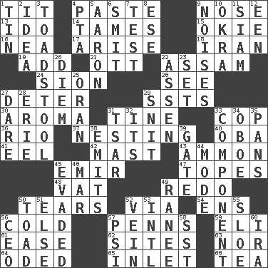 ACROSS 1. Teat (slang) 4. Thick mixture 9. Sense of smell 13. Wedding promise 14. Domesticates 15. Migrant worker of the '30s 16. Teachers' org. 17. Originate 18. SW Asia republic 19. Say or write further 21. Baseball player Mel 22. Indian state 24. The Jewish people; Israel 26. Observe 27. Prevent from occurring 29. Fast planes 30. Scent 31. Prong on a fork 33. Police officer (slang) 36. River (Sp.) 37. Snuggling 40. Chief or king in Benin or Nigeria 41. Snakelike fish 42. Vertical spar for supporting sails 43. ID or VA city 45. Arab leader 47. Drinks excessively 48. Large container 49. Do over again 50. Rends 52. By way of 54. Followers of ems 56. Chilled 57. Actor Sean's family 59. Biblical high priest 61. Comfort 62. Settings 63. Not either 64. Wrote a lyric poem 65. An arm off of a larger body of water 66. Afternoon social gathering DOWN 1. Shallow baking pan 2. The main thing one is thinking about 3. Inedible or poisonous agaric 4. Parent Teacher Assoc. 5. Composer Copland 6. Stricken, poetically 7. Trial 8. Compass dir. 9. Annoying sounds 10. Gumbo ingredient 11. Thailand, formerly 12. Car or cant ending 20. South Vietnam president (1954) 22. NE Netherlands city 23. Put into a specified state 25. NW Algerian seaport 27. Have the gumption 28. 4th largest of the Great Lakes 29. In a ____ (agitated or irritated) 31. Russian ruler of old 32. It is 33. Piece 34. Mitch Miller's instrument 35. Zero-star reviews 38. Gives off 39. Yard entry 44. Method 45. Eluded 46. Spoil 49. Indian princess (variant) 50. Frog relative 51. Otherwise 52. Distinctive style or manner 53. International (abbr.) 55. A type of plum 56. Corporate head (abbr.) 57. Air pressure measure (abbr.) 58. Fast jet (abbr.) 60. Lyricist Gershwin