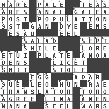 ACROSS 1. Female horse 5. Light colored 9. Afternoon social gatherings 13. Ancient Greek god of war 14. Of or related to the anus 15. An organ shaped like a helmet 16. Mail 17. Census information 19. Fast jet (abbr.) 20. Separate the seeds from cotton 21. Color 22. Followers of ems 23. He sold his birthright 25. Snakelike fish 26. First course 30. Back-to-school mo. 34. Grin 35. Old wives' tales, e.g. 36. Needle case 39. Food holder 42. Small Philippine buffalo 43. Hiding places for outlaws 44. It is permitted: Lat. 46. In a ____ (agitated or irritated) 47. Fur scarf 48. Oval reproductive body of a fowl 51. The sixth month of the Jewish calendar 54. Institute legal proceedings 57. Lion 58. Attila the _ 60. Actress Charlotte 62. Interpreter 65. "Corrida" creature 66. Match 67. Pale green bean 68. So be it 69. Nanny 70. Stitch closed the eyes of (a falcon) 71. Armed conflicts DOWN 1. Atlas contents 2. Came up 3. Musical pauses 4. Eastern Standard Time (abbr.) 5. Dad 6. Soon (poet.) 7. Infant locale 8. Evade 9. Make lace 10. Writer Wiesel 11. A really long time 12. Without 15. Highlander 18. Potassium hydroxide 20. Island territory of the United States 24. Help 27. Mouth edge 28. 100% 29. Allots cards 30. Scheduled 31. Period of immesurable duration 32. Adept person 33. Afternoon social gathering 36. Begley and Asner 37. Nine, plus one 38. Single; one (prefix) 40. Teat (slang) 41. Environmental prefix 45. Flair 48. Otherwise 49. Set 50. Finish lines 52. Odor 53. Less widely known 54. Comedian Laurel of Laurel & Hardy 55. Capital and largest city of Mongolia 56. Merit 58. Dwelling 59. Mountain range 61. Immeasurably long periods of time 63. Teachers' org. 64. Neckwear 65. The 23rd letter of the Hebrew alphabet