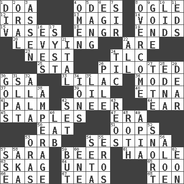 ACROSS 1. ___ good deed 4. Lyric poems 8. Stare at amorously 12. Big collection agency 13. Wise men 14. Empty area or space 15. Flower holders 18. Engineer (abbr.) 19. Extremities 20. Imposing or collecting, as a tax 22. "We ___ not amused" (Victoria) 23. Egg locale 24. Affectionate concern, for short 25. R.R. building 26. Manned the helm 30. Girls' org. (abbr.) 33. Pale purple color 36. Method 37. Spanish pot 39. Petroleum 40. Inactive volcano in Sicily 41. Inside of hand 42. Contemptuous expression 44. Hearing organ 45. Paper fasteners 47. Period 50. Consume 51. I made a mistake 53. Globe 54. French poetic form 57. "Two Mules for Sister ____" 59. Fermented drink made from hops 61. White Person, in Hawaii 63. Heroin 64. To (old English) 65. Friend of Pooh 66. Relaxation 67. Afternoon social gatherings 68. "___ Little Indians" DOWN 1. HTML Container Element 2. Relating to the mouth 3. NE Netherlands city 4. Sign of things to come 5. Mild oath, euphamism for damn 6. Oval reproductive body of a fowl 7. Title for a knight 8. Conquer 9. Went 10. Flaplike covering 11. Begley and Asner 16. Nights before holidays 17. System (abbr.) 21. Slanted text style (abbr.) 22. 100% 24. Nervous spasm 26. Diluted with white 27. Carryall 28. Pulitzer Prize-winning author Ferber 29. Letter starter 30. Republicans 31. Narrow board 32. Silent film actress Nazimova 34. Charged particles 35. Untruth 38. Electrical Measurement 42. Put into a specified state 43. Vintage cars 46. Experiment locale 48. Writer of Portnoy's Complaint (1969) 49. Capital of Western Samoa 52. Derisive sound 53. Mouths or openings 54. Bristle 55. Greek god of love 56. Medicinal plant 57. Compass dir. 58. Alias (abbr.) 59. Yet 60. Compass dir. 62. A really long time