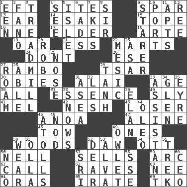 ACROSS 1. Newt 4. Locates 9. Practice fight 13. Hearing organ 14. 1973 Nobel Price Winner (Physics) Leo 15. Drink excessively 16. Compass dir. 17. A person who is older than you are 18. Johnson of "Laugh-In" 19. Rowing implement 21. Curvy letter 22. Shops 24. Do not 26. Compass dir. 27. Role for Stallone 29. Russian ruler of old 30. Off-Broadway awards 31. Mountain range southwest of Kyrgyzstan 33. Personal question 36. 100% 37. Center 40. Mischievous 41. Cartoonist voice _ Blanc 42. Soft 43. Failure 45. Small Philippine buffalo 47. Place in a line 48. Pull behind 49. Washington bills 50. Forest 52. Fool 54. Baseball player Mel 56. 1994 drama film starring Jodie Foster 57. Makes a sale 59. Curve 61. Give a ring to 62. All-night dance parties 63. Born 64. Mouths or openings 65. Feeling or showing extreme anger 66. Ring climax DOWN 1. Car or cant ending 2. Papal veil 3. Excercise machine 4. Perceive with the eye 5. Small island 6. Bits 7. Supplements with great effort 8. Title for a knight 9. A viewer who gazes fixedly 10. Left side of a ship or aircraft 11. Flats, for short 12. Portuguese money of account (variant) 20. Loose flowing garment 22. Of or pertaining to a meson 23. White ___ sheet 25. Characteristic smell of wine 27. Wander 28. Competent 29. Hyperbolic tangent 31. At sea 32. French article 33. Helper 34. Small, secluded valley 35. Jane of fiction 38. Overwhelms 39. Liveliness 44. Butter sub 45. Ringlike coral islands and reefs 46. Dreamland 49. A small or young owl 50. Erode 51. Rounded earthenware pot or jar 52. Letter starter 53. Inventor's middle name 55. Long journey 56. Non-commissioned officer (abbr.) 57. _ Lanka 58. Compass dir. 60. Corporate head (abbr.)