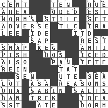 ACROSS 1. Penny 5. "___ Little Indians" 8. Sorrow 11. Length times width 12. Wrote a lyric poem 14. Eastern Standard Time (abbr.) 15. Typical standards 17. Vertical member of a panel or frame 18. Arrange properly for use 19. Contrary to your interests or welfare 21. Affectionate concern, for short 22. Lyricist Gershwin 23. Area sheltered from the wind 24. Binary compound 25. It would 27. Plant excrement 28. Remainder 31. Fastener 35. Barrel 37. Opposed to 38. Expression of disdain 39. Two (Sp.) 41. On the rocks 42. In addition 43. Baking dish 45. False hair 46. It's straight from the horse's mouth 47. Make lace 49. Elected rep. 51. Shoshoni 52. Ocean 55. Car dealer's back yard 57. White ___ sheet 60. Thinks logically 62. Mouth or opening 63. Unit of acoustic absorption 65. Table seasonings 66. Forbid 67. Long journey 68. It may be bright or harebrained 69. Fast jet (abbr.) 70. Had dinner 71. Dormintory (informal) DOWN 1. Lessep's creation 2. Wear away 3. Impudent aggressiveness 4. Docile 5. Small child 6. Prepare for publication 7. 1994 drama film starring Jodie Foster 8. Dwelling 9. One who makes use of a thing 10. Singer James 13. Tenth: prefix 16. Indian titles of respect 17. Oozed 20. Neighbor of Neb. 26. Distinguishing feature 29. Proofreading order 30. Event that recurs at intervals 31. Coast Guard woman 32. The longest river in the world 33. Helper 34. Give a jingle 36. Grand Old Party 40. Titan orbits this 44. Nathan's nickname 48. Afternoon social gatherings 50. Political cartoonist Thomas 52. Twentieth part of a lira 53. Keyboard key 54. Indian state 55. Tennis shots 56. Mouths or openings 58. "Two Mules for Sister ____" 59. Collude with 61. Alleged 64. Mamie's mate
