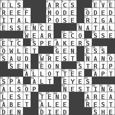 ACROSS 1. Raised railways 4. Curves 8. Night before a holiday 11. Coral ridge 13. Method 14. Wrote a lyric poem 15. Slanted text style (abbr.) 16. Airs 17. Capital of Latvia 18. Substance 21. Relating to or accompanying birth 22. Put on (as clothing) 23. Environmental prefix 25. Compass dir. 26. And so on (abbr.) 29. Orators 32. A small or young owl 34. Commissioned mil. rank 35. Double-curved letter 38. Saudi Arabian king (1953-1964) 39. Take or capture by force 41. Billionth: prefix 43. Elected rep. 44. A really long time 45. Long narrow piece of something 46. One to whom something is allotted 50. Fitting 51. Health resort 54. The first octave above the treble staff 55. Sight organs 57. Columnist Joseph or Stewart 59. Inhabiting a nest 63. For fear that 64. Be inclined (to) 67. Length times width 68. Collude with 69. Toward shelter 70. Respite 71. Lair 72. Passed on 73. A female animal or person DOWN 1. 4th largest of the Great Lakes 2. Allows 3. Oceans 4. Electrical Unit 5. Friend of Pooh 6. Music discs 7. Perceive with the eye 8. Prepares for publication 9. Viva Las _ 10. Peak District village in England 12. Soared 14. Mouth or opening 19. Egg locale 20. Head covering 21. And not 23. Supplements with great effort 24. Penny 26. Greek goddess of the dawn 27. It was, poetically 28. A slight indication 30. Rep 31. Emitted 33. Pulitzer Prize-winning author Ferber 36. "Two Mules for Sister ____" 37. Clip 39. Not ill 40. Carrot, for example 42. Elect 45. Perceives with the eye 47. Pet locale 48. Looked after 49. Sight organ 51. Vegetable dish 52. First-year military academy student 53. NE Netherlands city 56. Play the lead 58. Baseball player Mel 60. Angers 61. Delicate 62. Yard entry 64. Bit 65. Connecticut Ivy Leaguer 66. Born