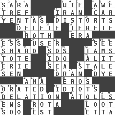 ACROSS 1. "Two Mules for Sister ____" 5. Shoshoni 8. Deep reverence 11. Not kosher 12. SW Asia republic 13. Automobile 14. Gossips 17. What propaganda does 19. Erase 21. Cigar-shaped 22. Writer of Portnoy's Complaint (1969) 23. Period 24. Double-curved letter 27. One who uses or employs something 29. Perceive with the eye 32. Pottery fragment 34. Mayday 36. Scottish caps 37. Carry 38. Wedding promise 39. Set down 40. One of the Great Lakes 41. Ocean 42. Lacking originality or spontaneity 43. Elected rep. 44. Northwest Algerian city 46. Color 47. Nanny (var.) 50. Greek god of love 52. Declaimed 55. Foolish or stupid persons 57. Conveyance 59. Ringlike coral islands and reefs 62. Followers of ems 63. Roll call or roster of names 64. Spoils 65. "Barney Miller" actor Jack 66. Eastern Standard Time (abbr.) 67. Singer James DOWN 1. Filthy place 2. "We ___ not amused" (Victoria) 3. Tear apart 4. Following 5. RI univ. 6. Clothes sense 7. Keyboard key 8. 1/640 square mile 9. Electrical Unit 10. Celtic language 12. Binary compound 15. Verbally 16. Puts into a specified state 18. Mouth or opening 20. College paper 24. _____ Park, CO 25. Dinah or Pauly 26. Smooth fabric 28. Cowboy competition 29. Vegetable dish 30. Poet Dickinson 31. First name in cosmetics 33. Portuguese money of account (variant) 35. Flew 36. Make lace 42. Snout, nose 45. Operatic vocal solo 47. "One Day ___ Time" 48. Distance measurement (Brit.) 49. Goodbye (Sp.) 51. Fur scarf 52. Lyric poems 53. Former U.S. Attorney General Janet 54. In addition 55. _ tizzy (2 wds.) 56. Narrow, elongated depression 58. Baseball player Mel 60. Car dealer's back yard 61. R.R. building