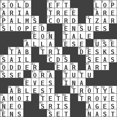 ACROSS 1. Disposed of to a purchaser 5. Bank Draft (abbr.) 8. Trim (branches) 11. Operatic vocal solo 12. Family _ (genealogy) 14. "We ___ not amused" (Victoria) 15. Insides of hands 17. Drawstring 18. Czar 19. Inclined 21. Takes place subsequently 23. A really long time 25. Story 26. Silent film actress Nazimova 27. Compass dir. 28. Purpose 31. Bar bill 33. Three (prefix) 35. Writing tables 37. Move on water 38. Music discs 40. Oceans 41. More peculiar 43. Ewer handle 45. Tate display 46. Compass dir. 47. Mouth or opening 50. Ballerina skirt 52. Nights before holidays 53. _ tizzy (2 wds.) 54. Most capable 56. Trinitrotoluene 61. Mine, in Marseilles 62. False hair 65. Collection of objects 66. Modern: prefix 67. Indian titles of respect 68. Ripens 69. Followers of ems 70. Put into a specified state 71. Political cartoonist Thomas DOWN 1. Plant excrements 2. Spoken 3. _ and Stitch 4. Moist 5. And so on (abbr.) 6. Back 7. Cigar-shaped 8. Goldbrick 9. Mouths or openings 10. For each 13. Ferber et al. 16. Sew up the eyelids of hawks and falcons 18. Third day of the wk. 20. Dunce 22. Downhill vehicle 24. Drug cop 26. Competent 28. One who makes use of a thing 29. Three-handed card game 30. Double-curved letter 31. Small amounts or degrees 32. Assistant 34. Binary compound 36. He sold his birthright 37. Distress signal 39. Suttee (variant) 42. Be footloose 44. Undersized animal 48. Musical pauses 49. Michaelmas daisies 51. Small pie 52. Connecticut Ivy Leaguer 54. So be it 55. Scornful sounds 57. Northwest Algerian city 58. Ancient Roman robe 59. Jacques Cousteau's middle name 60. For fear that 61. A saturated hydrocarbon 63. Make a knot 64. Eastern Standard Time (abbr.)