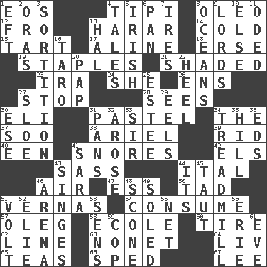 ACROSS 1. Greek goddess of the dawn 4. Native american tent (variation) 8. Margarine 12. From 13. Ethiopian city, capital of Harari 14. Having a low temperature 15. Small pie 17. Place in a line 18. Celtic language 19. Paper fasteners 21. Cast a shadow over 23. Retirement account (abbr.) 24. A female animal or person 26. Followers of ems 27. Close up, plug up 28. Observes 30. Connecticut Ivy Leaguer 31. Soft color 34. Definite Article 37. "Barney Miller" actor Jack 38. Satellite of Uranus 39. To free from 40. Car or cant ending 41. Sounds asleep 42. Raised railways 43. Backtalk 44. Slanted text style (abbr.) 46. Wind 47. Double-curved letter 50. Small boy 51. Actresses Bloom and Felton 54. Ingest 57. Cassini of fashion 58. Learning spot: Fr. 60. Become fatigued 62. Actor's bit 63. Music written for nine 64. 54 in ancient Rome 65. Afternoon social gatherings 66. Moved rapidly 67. Area sheltered from the wind DOWN 1. Bank Draft (abbr.) 2. Mouths or openings 3. Casting lots 4. Stories 5. From or relating to Ireland 6. Baking dish 7. Angers 8. Seas 9. Domineers 10. Otherwise 11. Wrote a lyric poem 13. Actor Linden 16. Pacific island yam 20. Infant food 22. Person who is morally reprehensible 25. First name in cosmetics 27. A type of plum 29. Snakelike fish 30. Compass dir. 31. Baking dishes 32. Came up 33. Title for a knight 34. Excercise machine 35. Land elevation 36. Begley and Asner 41. "Two Mules for Sister ____" 43. Burns superficially 44. ___ a Wonderful Life 45. Pulled tight 46. Sports stadium 48. Biscuitlike quick bread 49. Having a sole or soles 51. Electrical Unit 52. Writer Wiesel 53. Elected reps. 55. Remaining after all deductions 56. 4th largest of the Great Lakes 59. Police officer (slang) 61. First lady