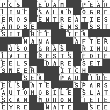 ACROSS 1. Personal Computers (abbr.) 4. Dutch treat 8. Lightbulb-shaped fruit 12. Actor's bit 14. Vegetable dish 16. Legendary monster 17. Greek god of love 18. Pleas 20. Came up 22. Followers of ems 23. Fast jet (abbr.) 24. Be seated 25. To riddle 28. Afternoon social gathering 30. Grandmother 31. Following 35. Bear (Spanish) 37. Pate de foie ____ 40. Tall New Zealand timber tree 41. 57 in ancient Rome 42. Musical pauses 44. Singer Brickell 45. Snakelike fish 46. Have the gumption 47. Arrange properly for use 48. Scornful expression 50. Hankering 52. Ocean 54. Writing tablet 55. Third day of the wk. 58. Raised railways 61. Had dinner 63. Practice fights 65. Car 70. Narrow board 71. Skim 72. Person of subnormal intelligence 73. Wig 74. Jane of fiction 75. Nathan's nickname 76. Observe DOWN 1. Entreaties 2. High-altitude cloud 3. Snout, nose 4. Compass dir. 5. One of the 12 tribes of Israel 6. Keyboard modifier key 7. Female horse 8. Plant holder 9. Armor plate that protects the chest 10. Ancient Greek god of war 11. Relief 13. Curvy letter 15. Gouge 19. Toward the sea 21. Epoch 26. Engineer (abbr.) 27. Having ears or earlike features 29. Anew 30. Annoying sounds 32. Event that recurs at intervals 33. Give off 34. Sorrow 35. Baking chamber 36. Drop; flow; fall 38. White ___ sheet 39. Long narrow piece of something 41. French article 43. Stalk of a moss capsule 49. 480, 500 or 516 sheets of paper 51. Music discs 53. Tiny particle 55. Stories 56. A salt of uric acid 57. First name in cosmetics 58. Comfort 59. "I Love _" 60. Play the lead 62. Inky black, to poets 64. Pacific Standard Time (abbr.) 66. Single 67. Retirement account (abbr.) 68. Car dealer's back yard 69. Compass dir.
